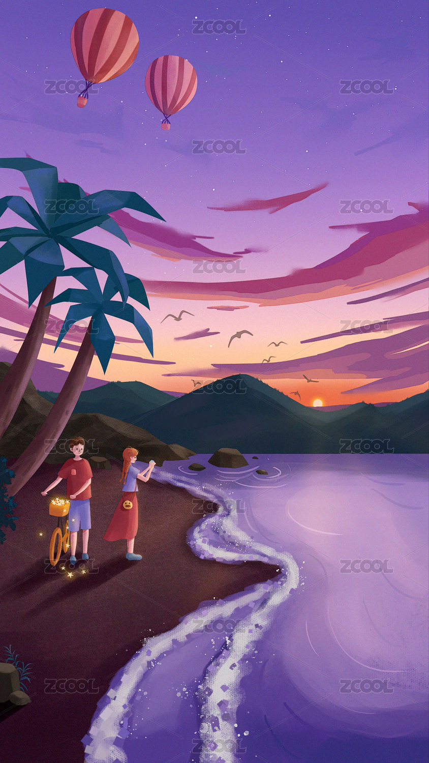 情侣夏季傍晚在海滩推着自行车散步治愈插画
