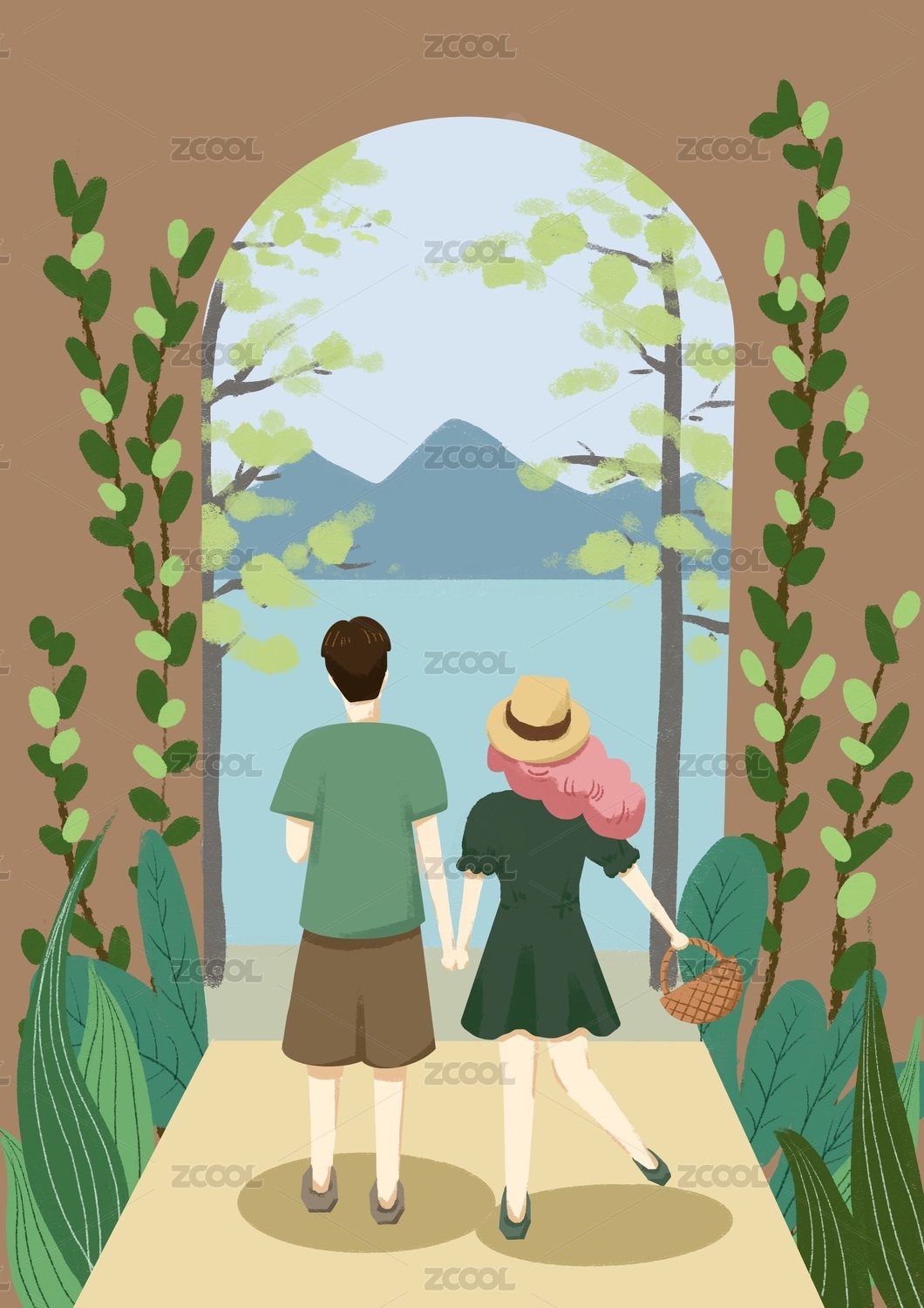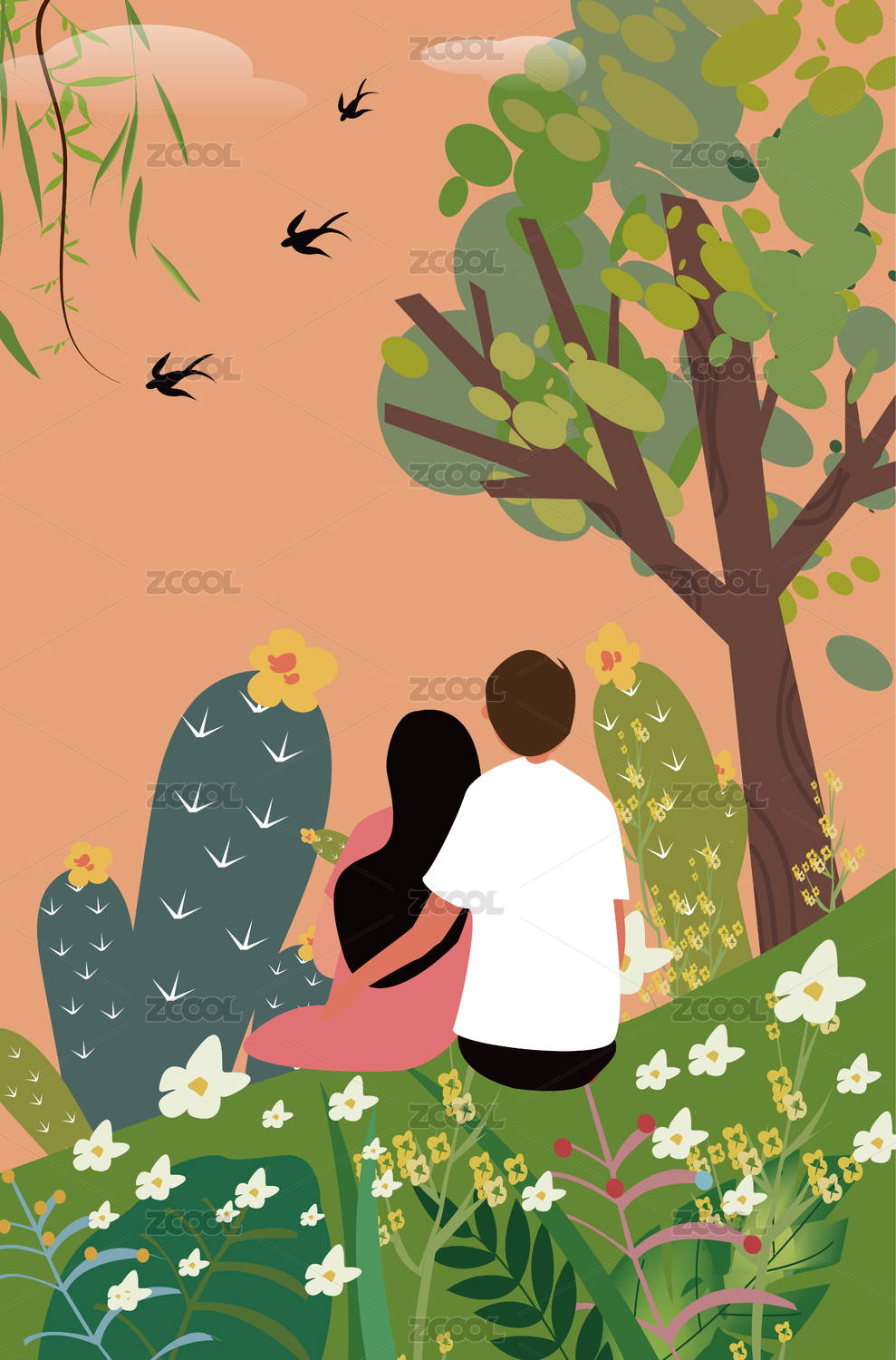 治愈系小清新插画一对年轻情侣坐在公园河边