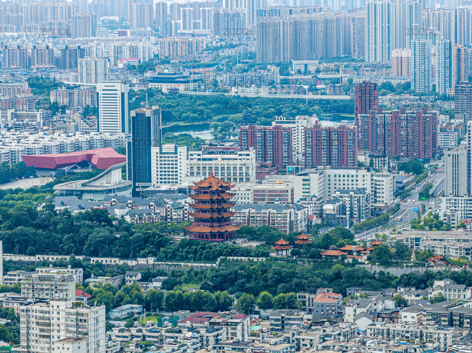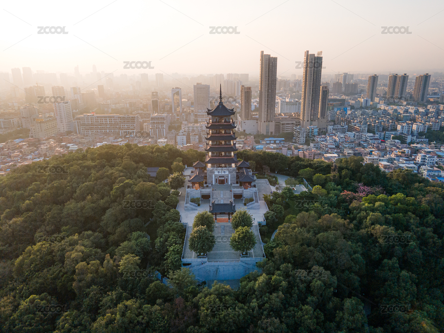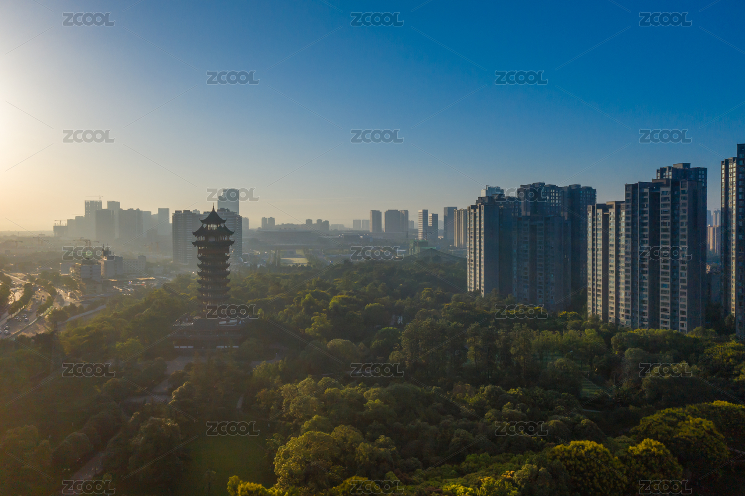 中国安徽省芜湖市湾沚区东湖公园楚风塔夜景航拍
