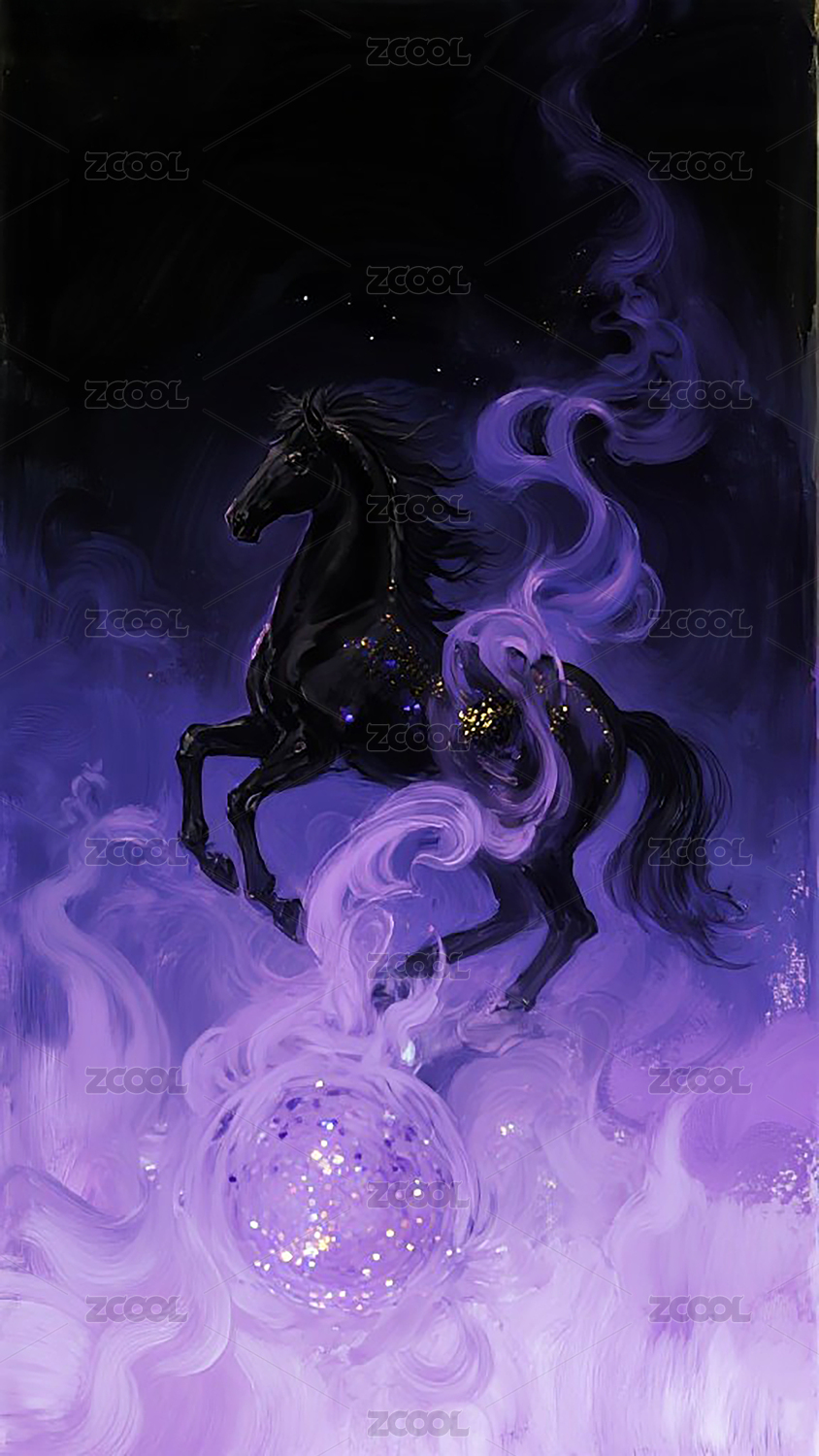 美式,暗黑,野马,骏马,鬃毛,紫色,眼睛,发光,黑夜,野兽