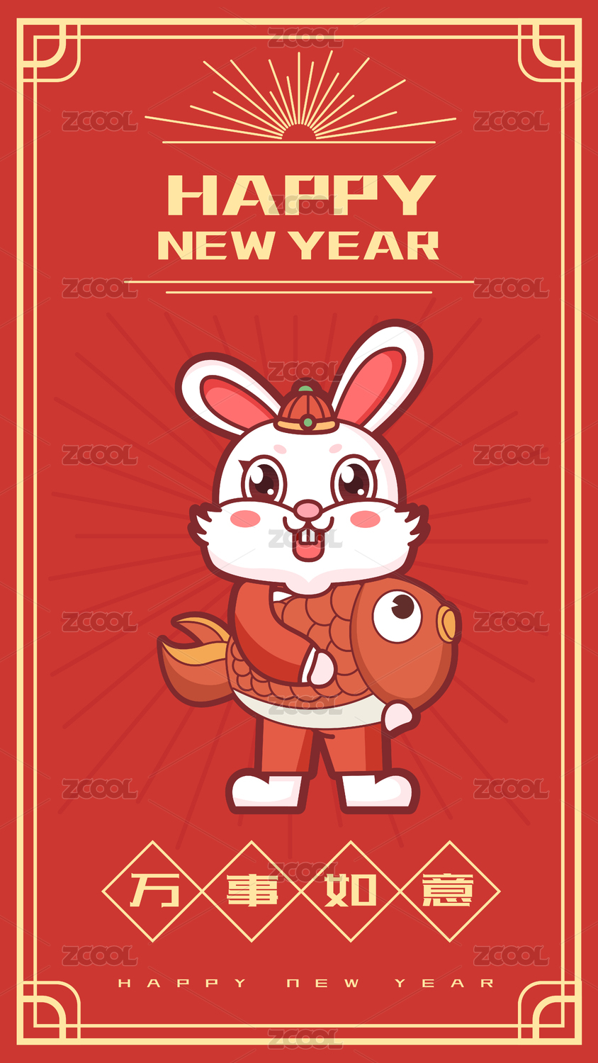 国潮吉祥新年春节抱锦鲤鱼兔子插画