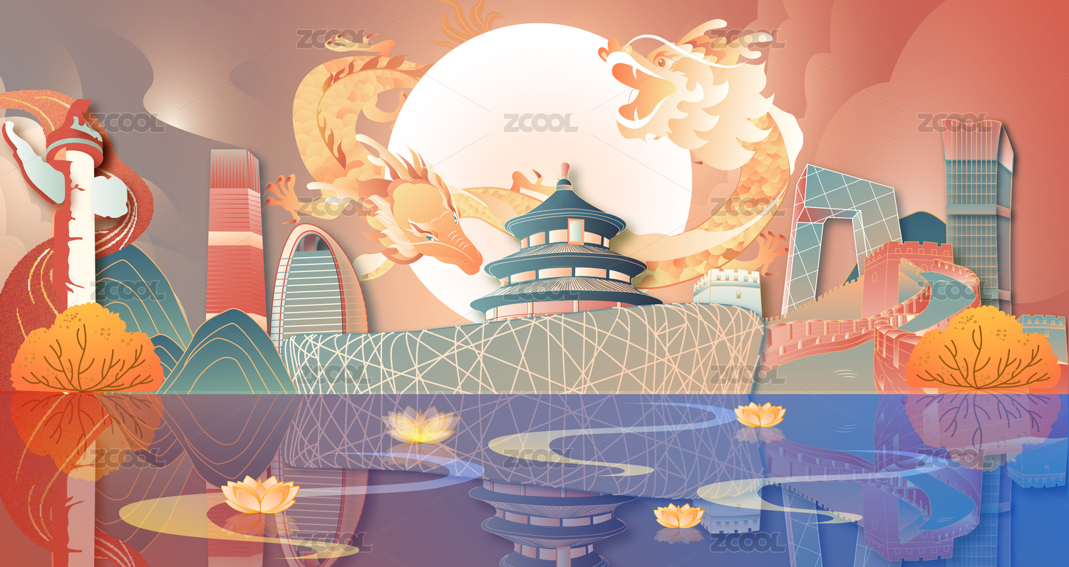 双龙戏珠中国现代建筑竖版国风矢量插画
