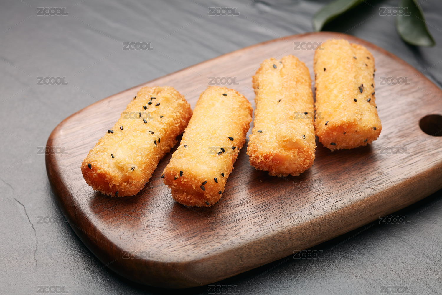暗色木纹桌上放着一盘油炸香蕉小吃