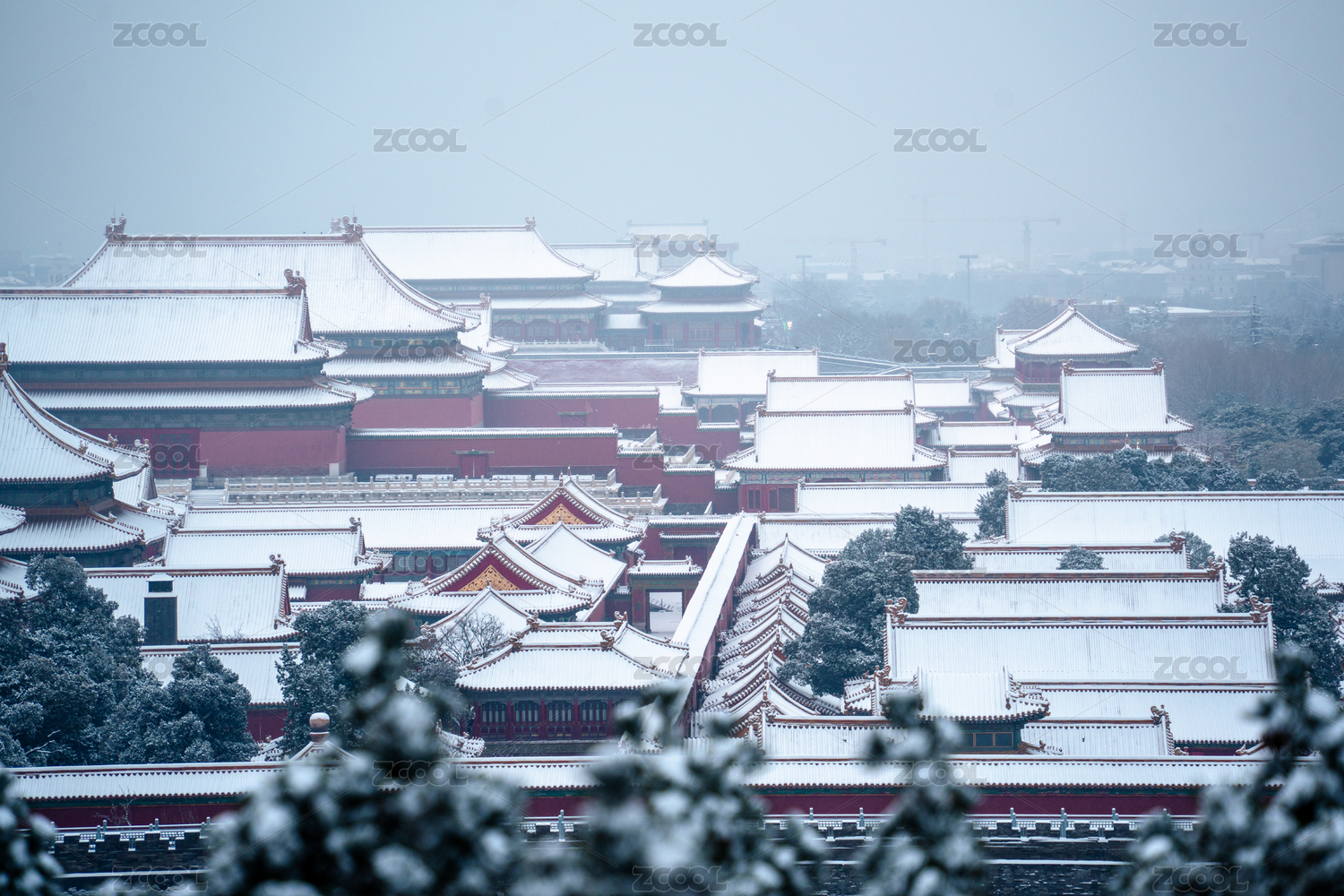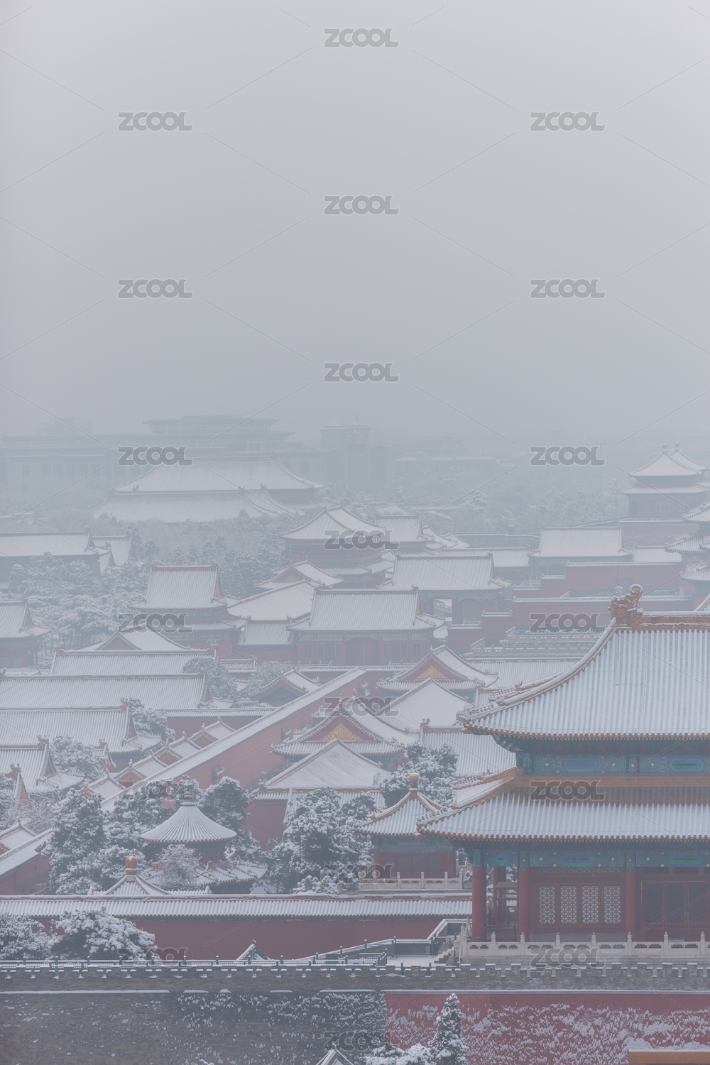 中国北京冬季景山公园视角俯瞰故宫雪后建筑风光