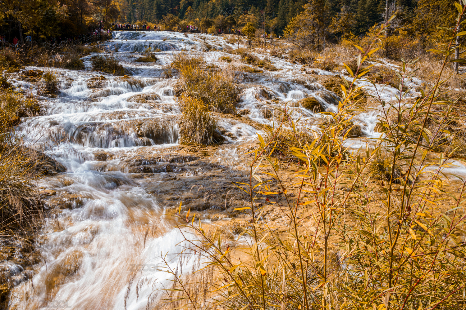 四川阿坝黄龙景区山间钙华地形瀑布流水