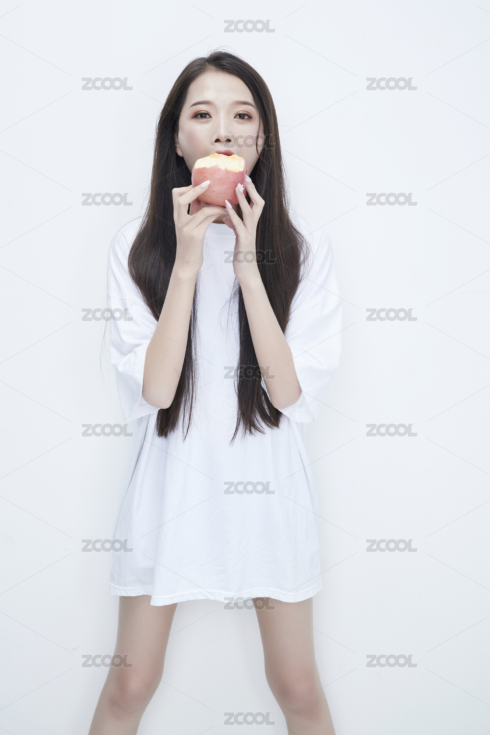 吃苹果的穿白色长T血衫的长发可爱少女人像
