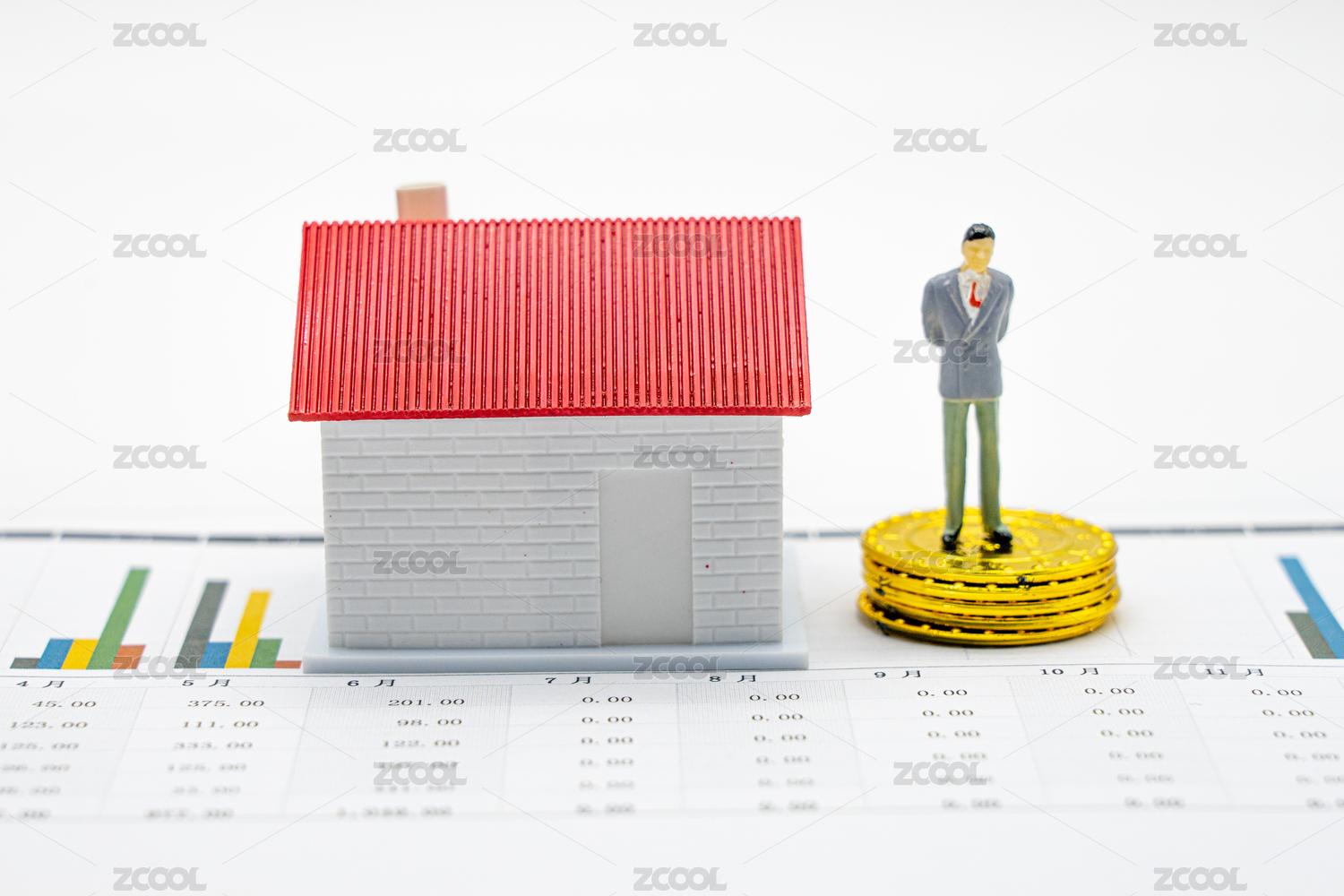 房屋房子金币房价房地产行情小人国微距图表报表概念