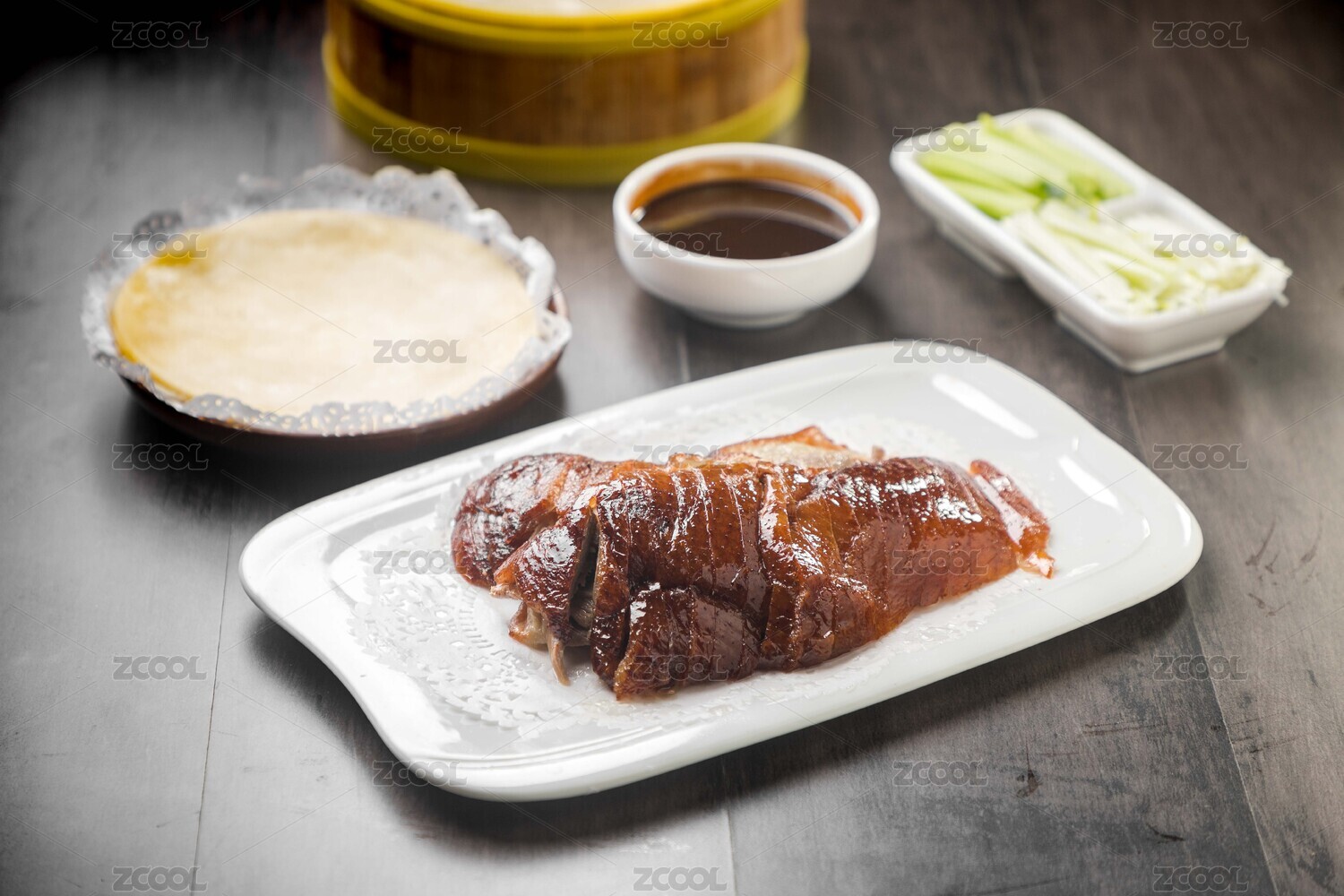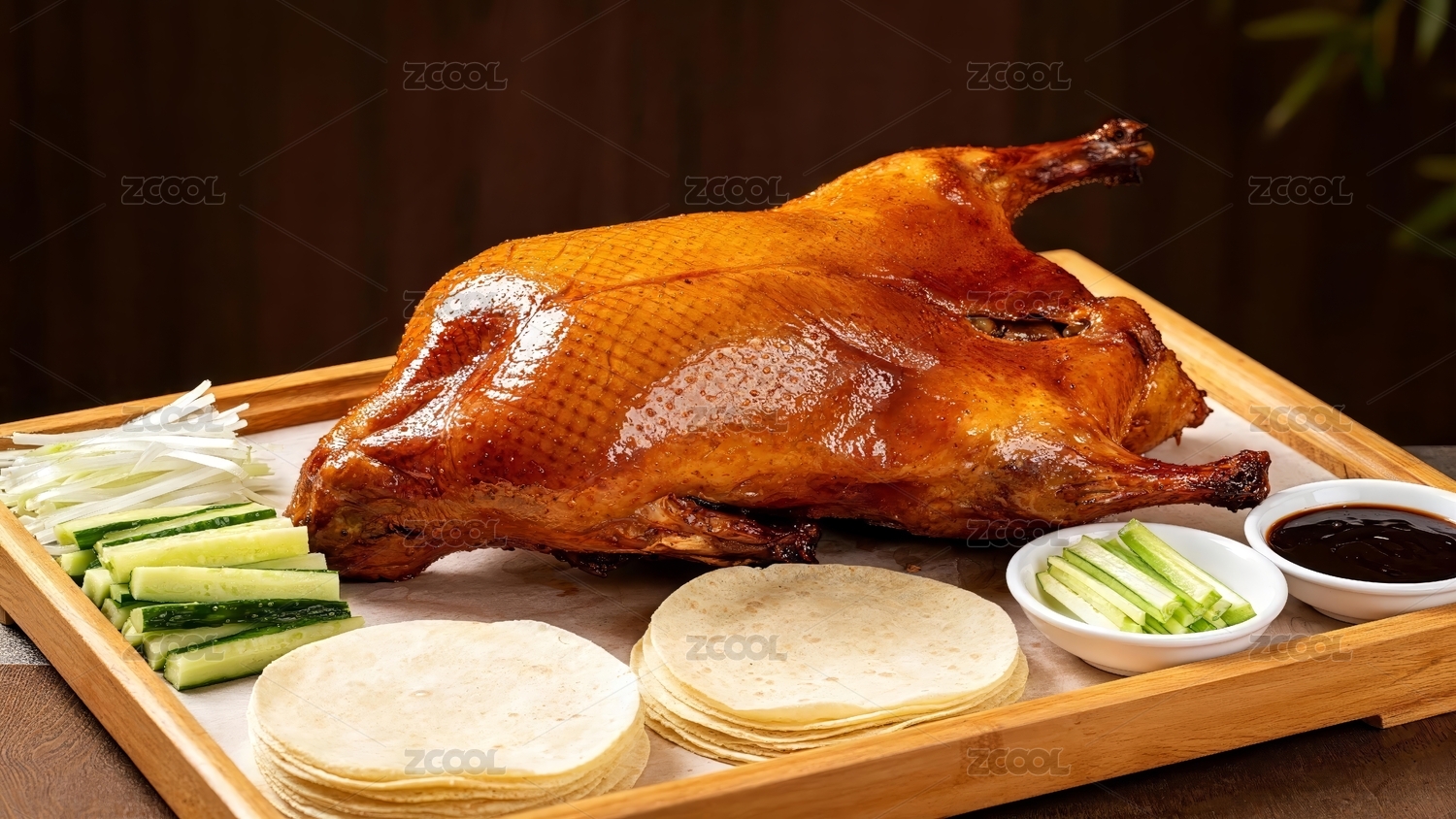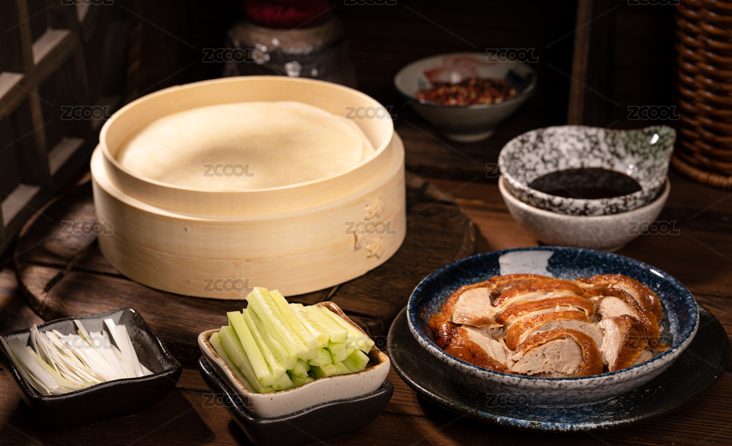 暗色木纹桌上放着一份烤鸭与卷好肉的春饼