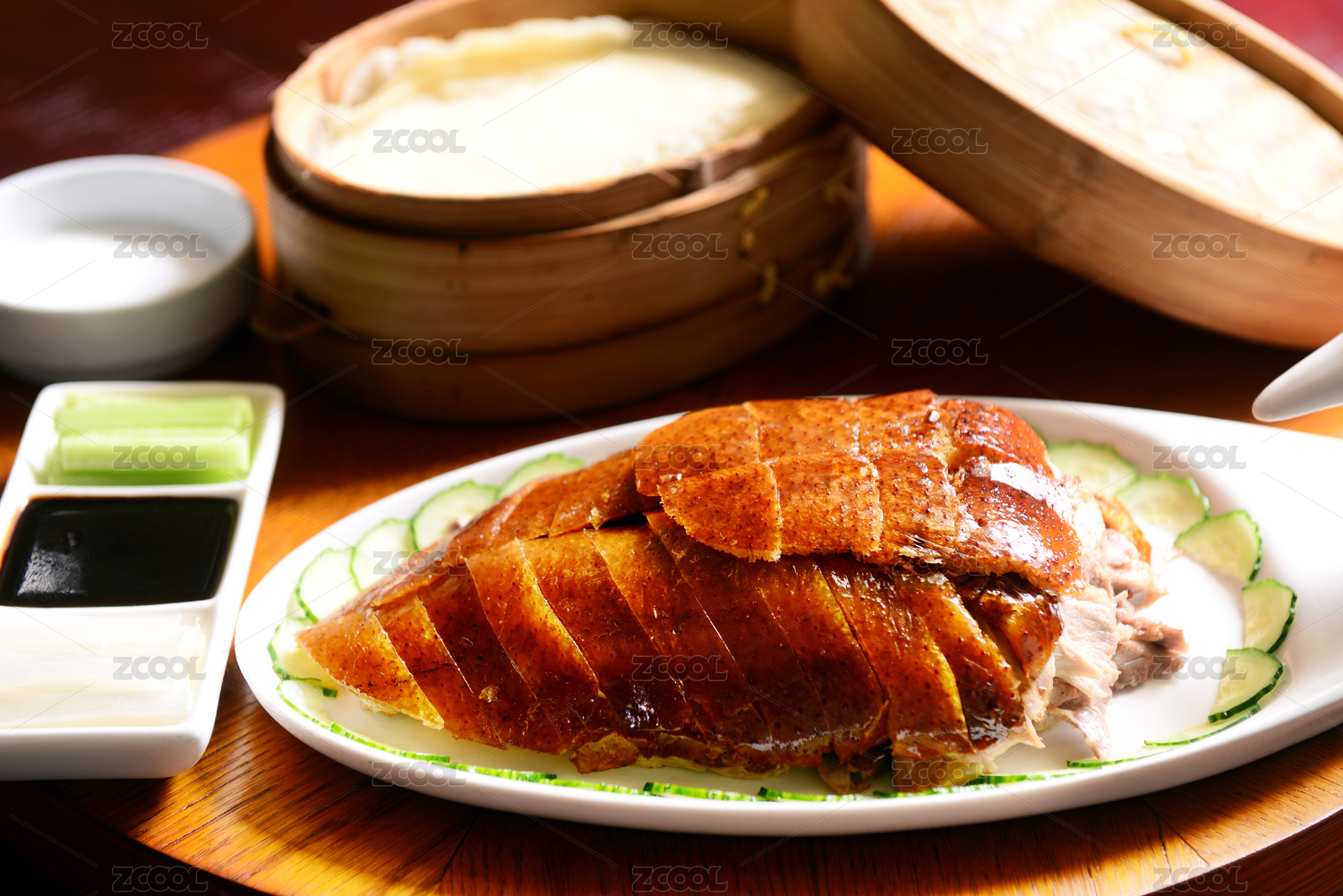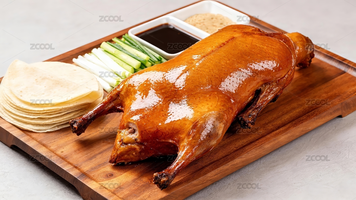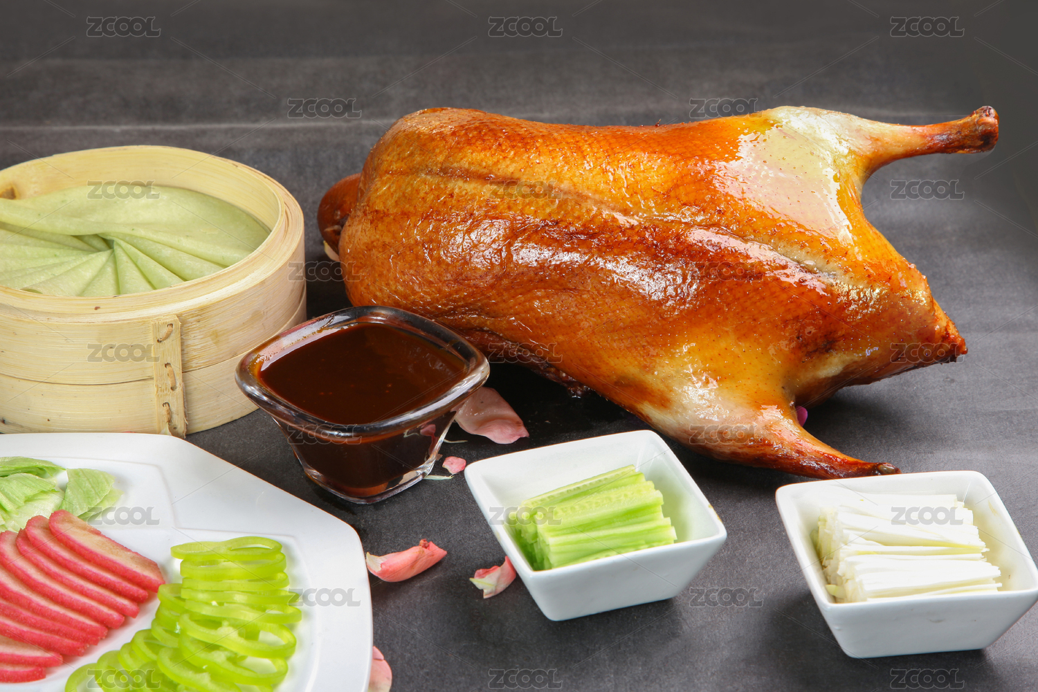 暗色木纹桌上放着一份烤鸭与卷好肉的春饼