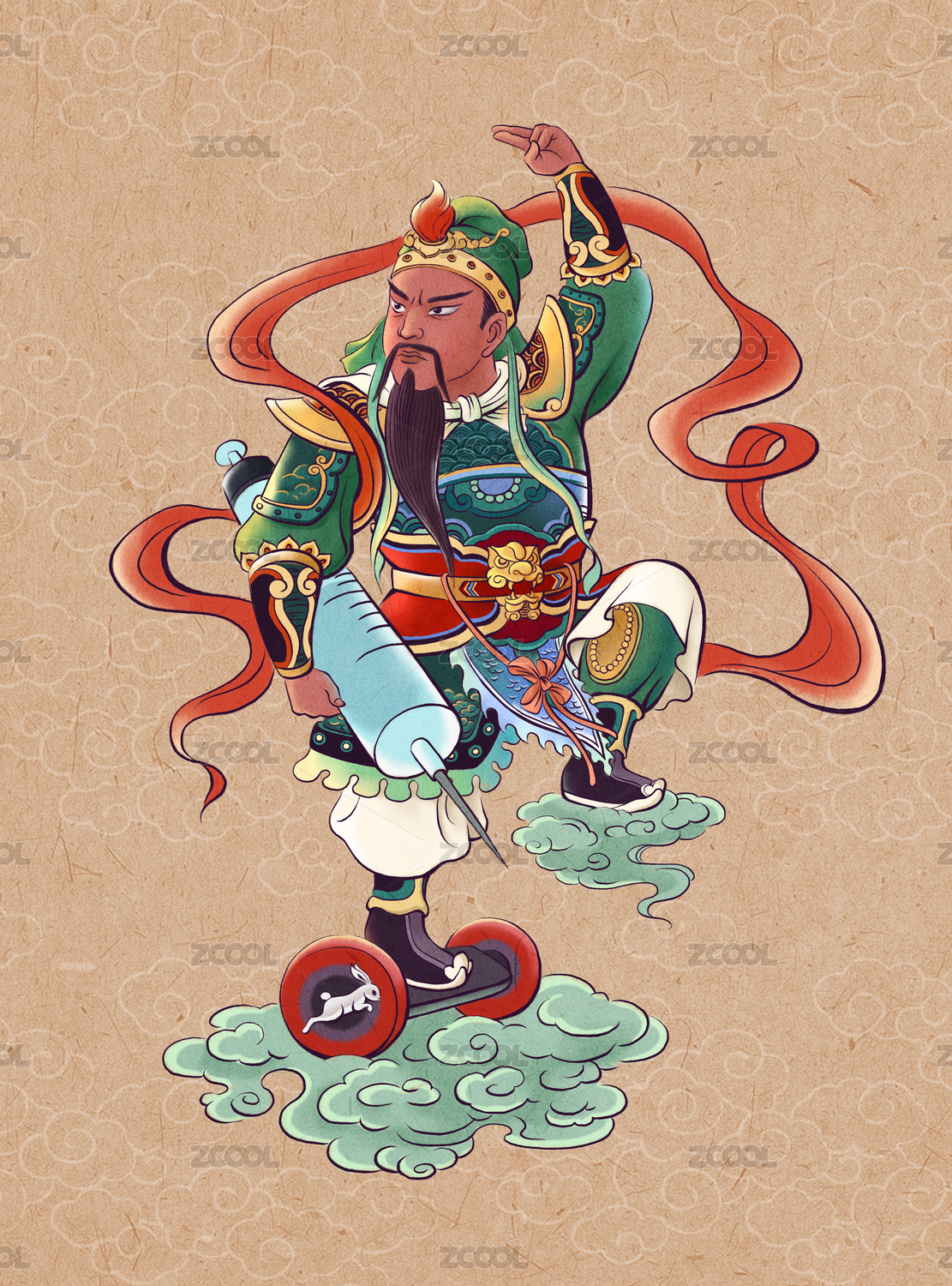 手持针筒脚踩平衡车身穿绿衣的门神关羽