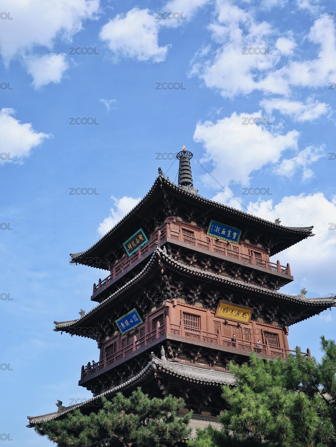 中式传统寺庙的三层塔楼仿古建筑