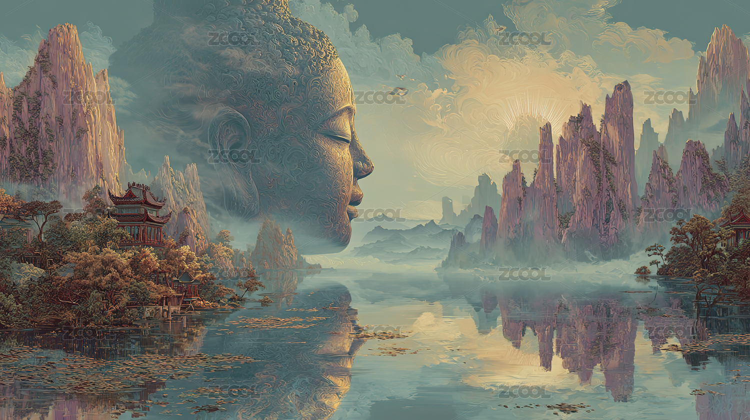 AIGC202407,神话,场景,大佛,神秘,奇幻,国潮,国风,光,天空