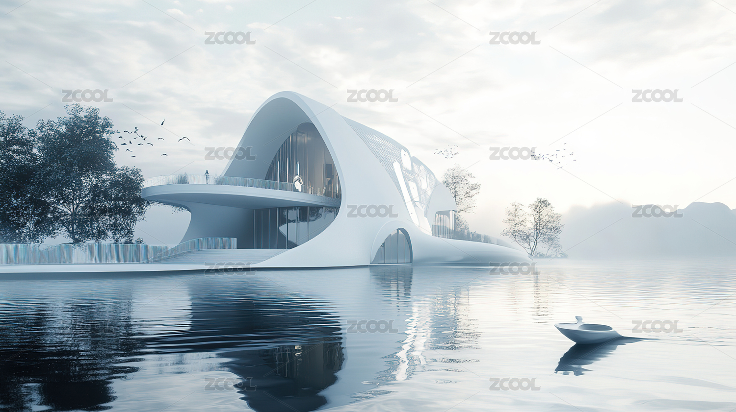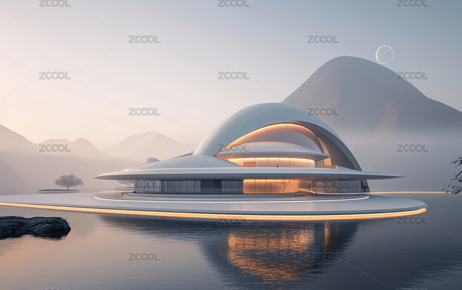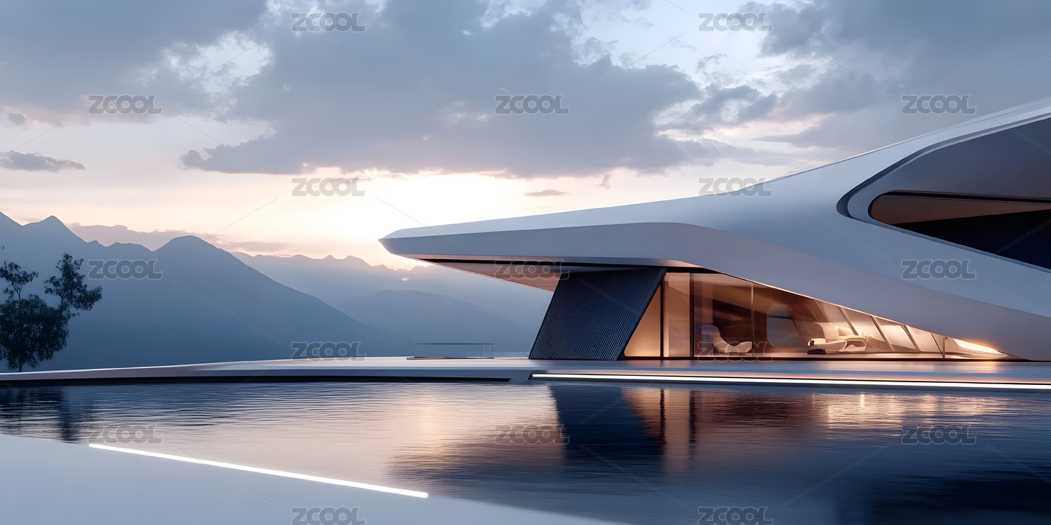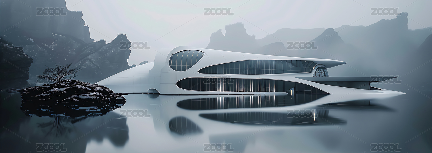 现代,建筑,度假,别墅,水,倒影,反射,山脉,云雾,白昼