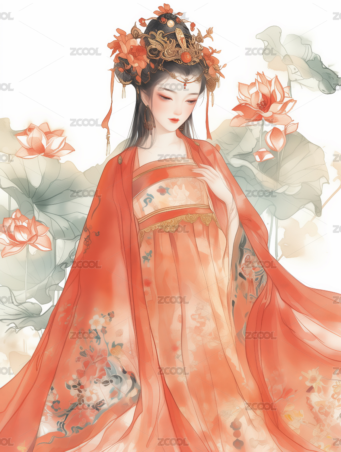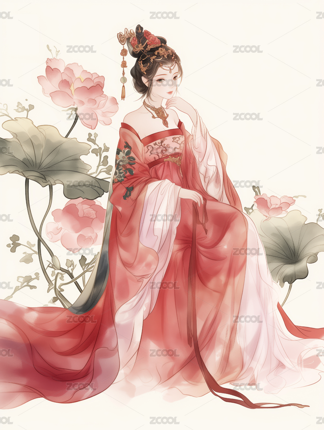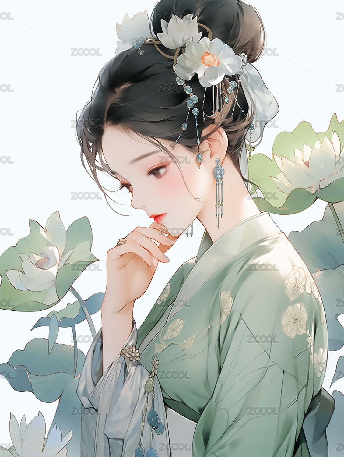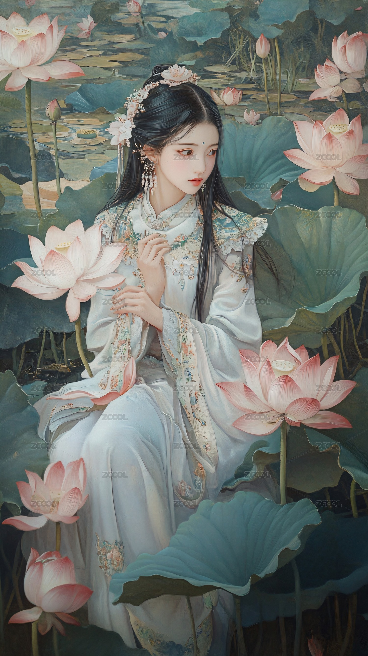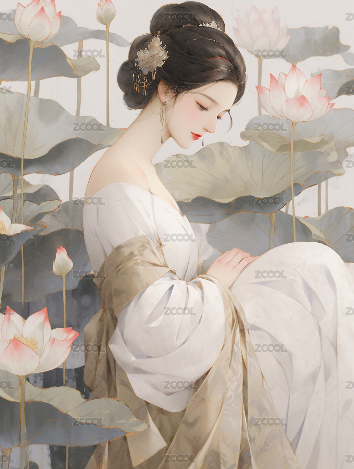 古装女子与荷花