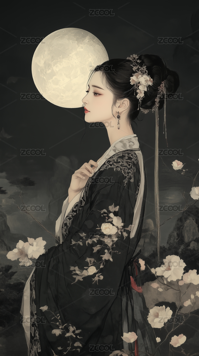 工笔画月光下的汉服女人