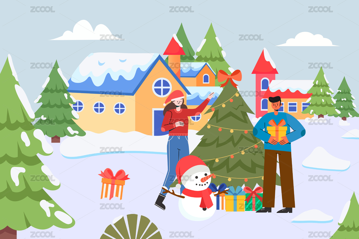 冬季,城市,公园,雪地,雪人,矢量,插画,欢乐,开心,下雪