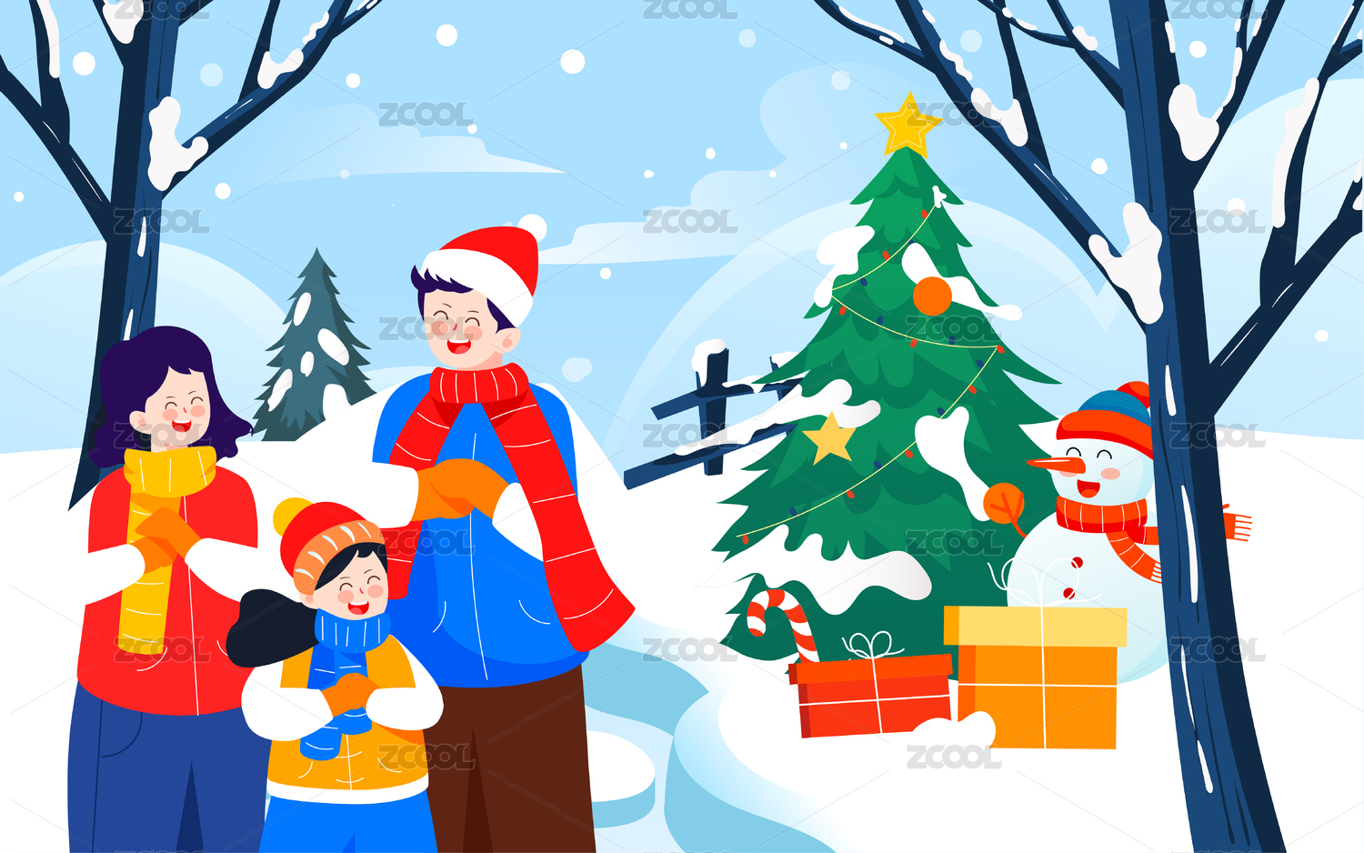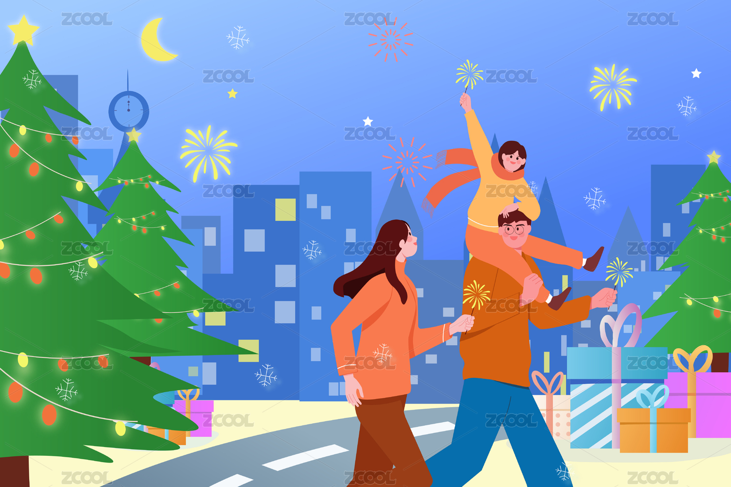 家庭元旦节圣诞节跨年庆祝矢量横版插画
