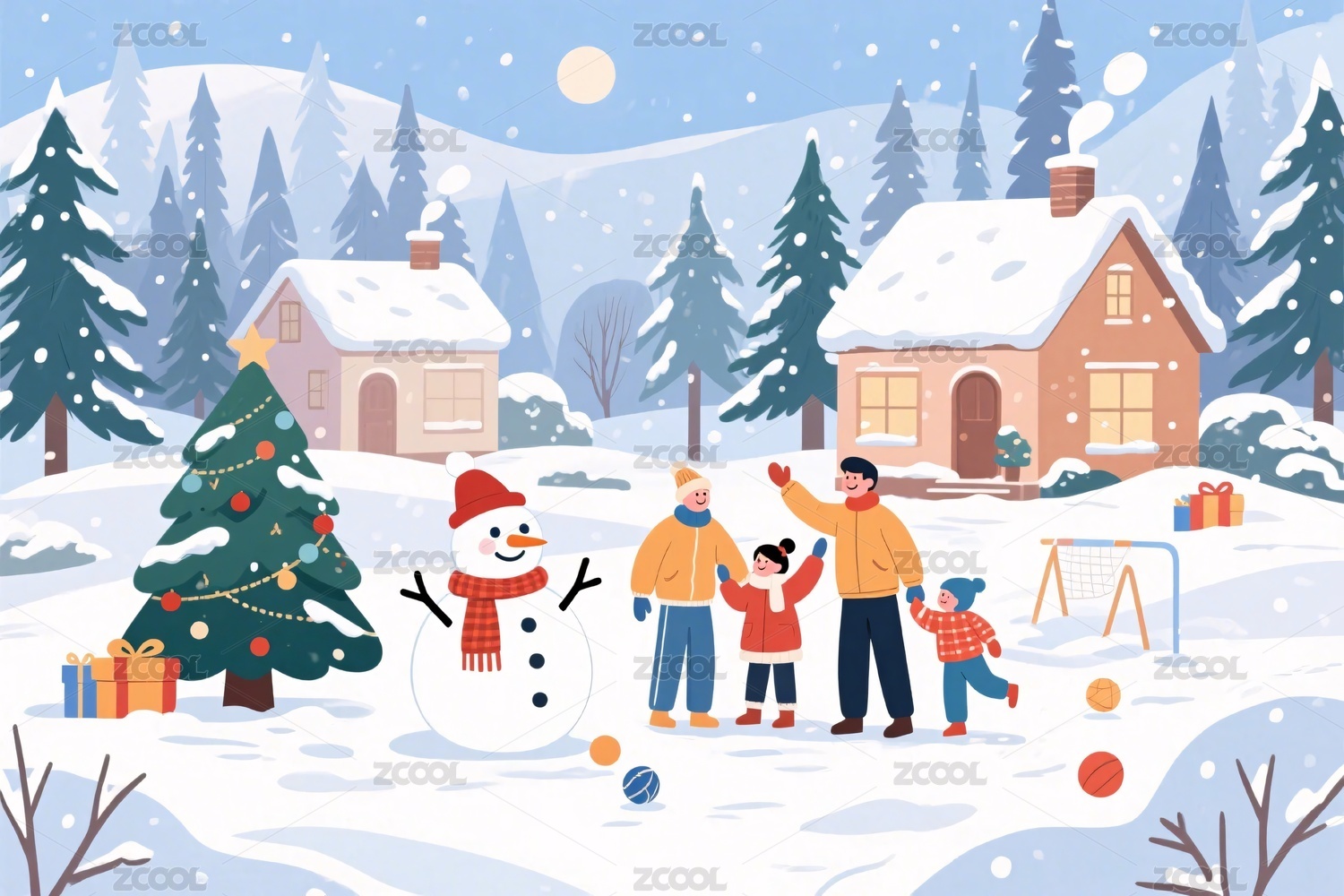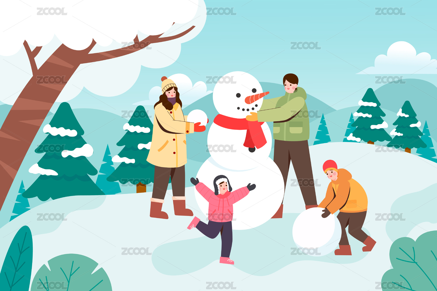 冬季大雪节气一家人户外堆雪人活动矢量插画