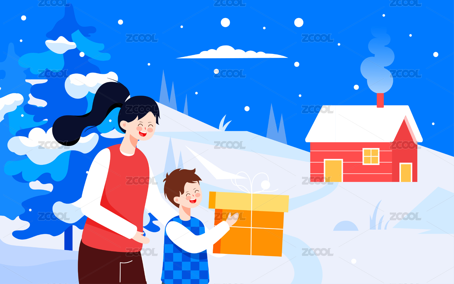 小寒大寒节气冬季一家人户外活动堆雪人插画