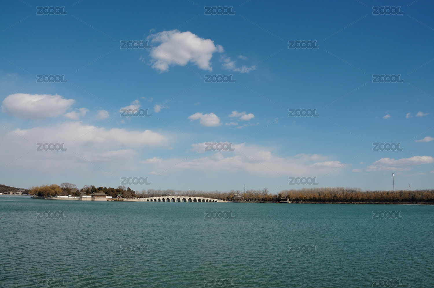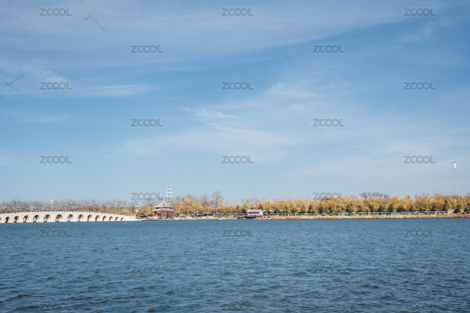北京颐和园公园春季桃花湖水西堤传统古建筑