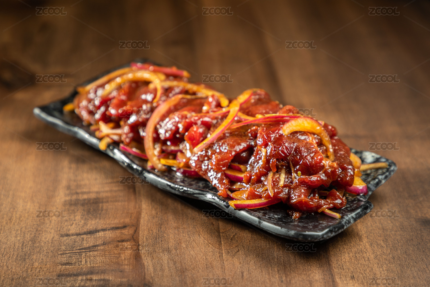 棕色木纹桌上 放着一份腌制牛板筋