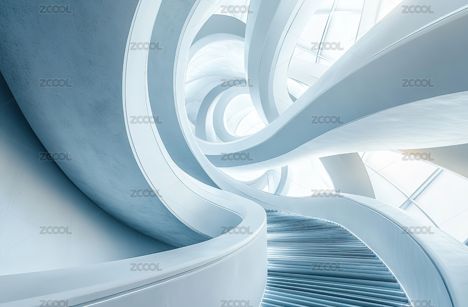 白色简洁有弯曲楼梯的宽大半开放室内空间