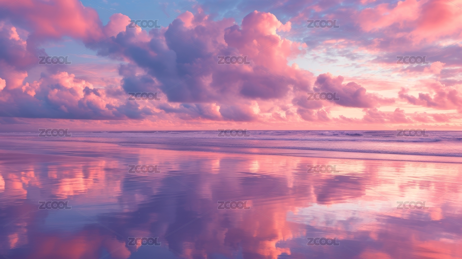 海滩日落云彩倒映水面