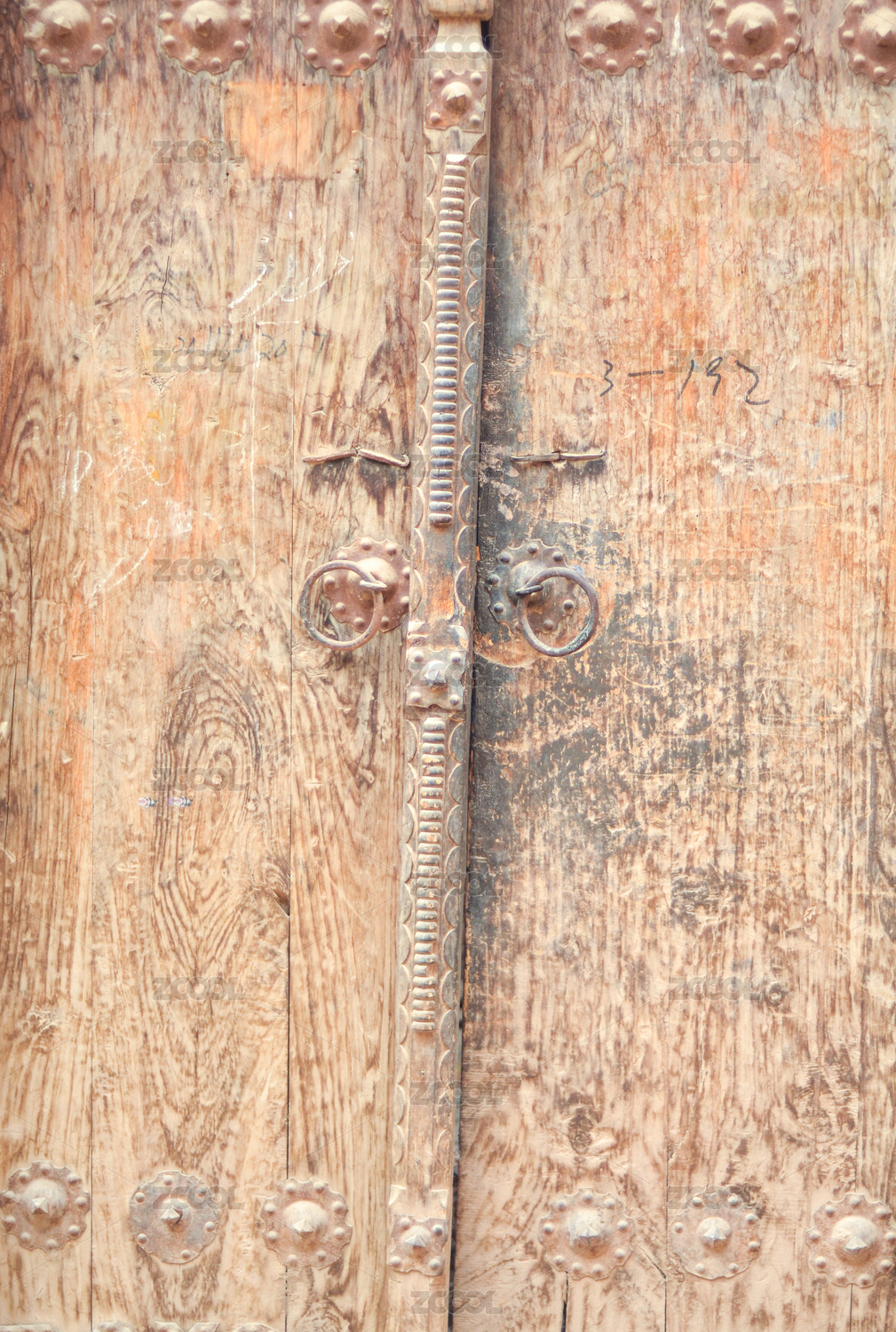 一扇年代久远的古朴斑驳蓝色油漆仓库木门