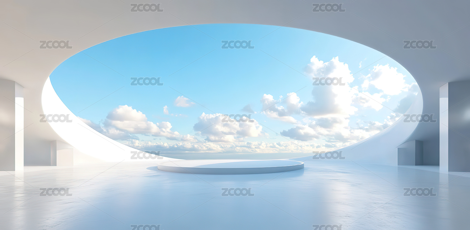 蓝天白云下的极简圆形现代建筑产品展台