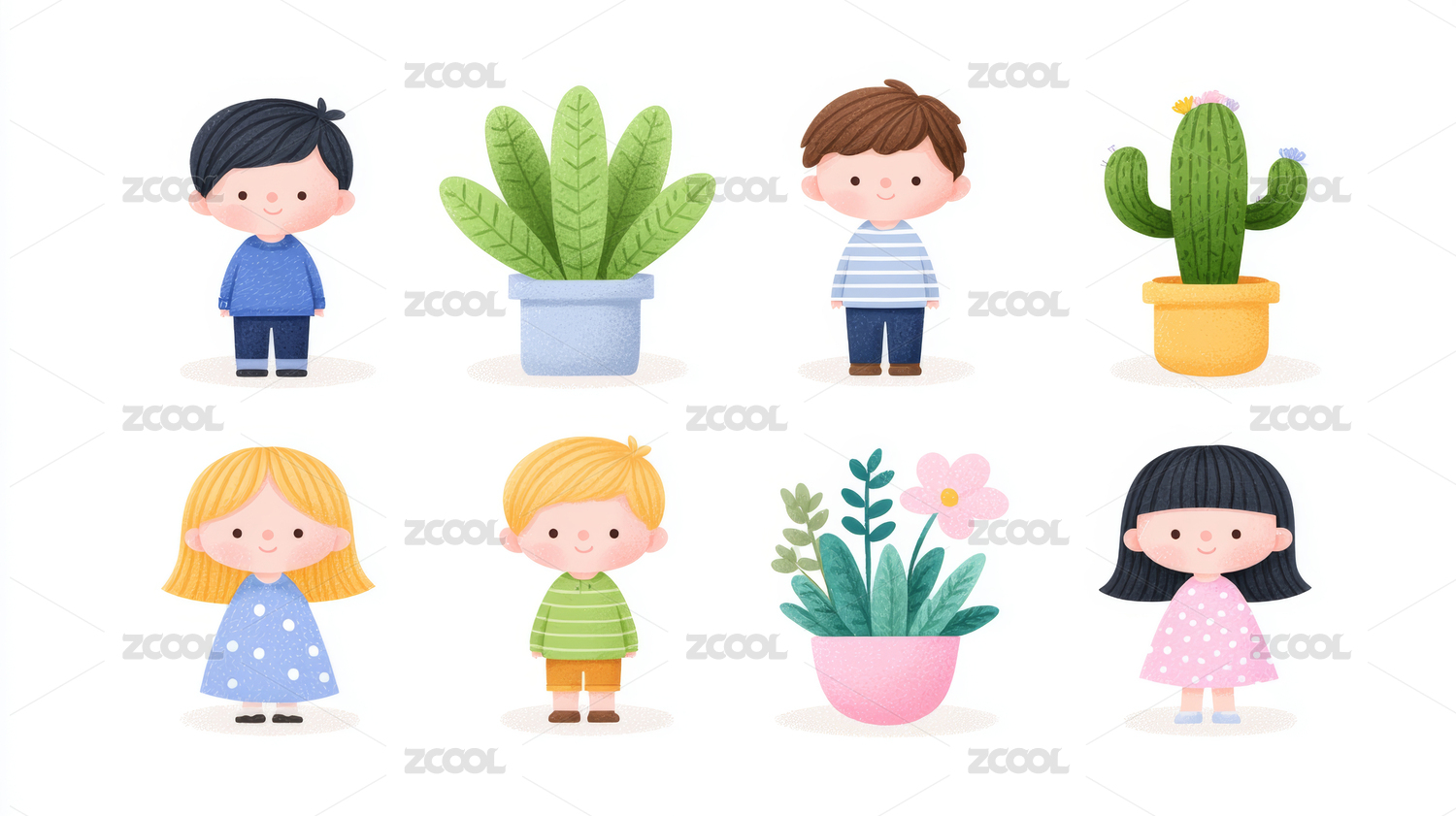 卡通人物和盆栽植物并排排列