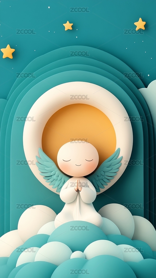 天使,祈祷,云朵,星空,月亮,可爱,梦幻,卡通,3D,插画
