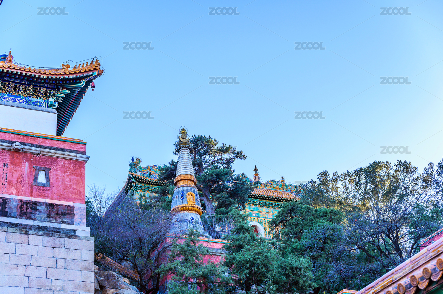 秋天蓝天下的北京颐和园公园的塔寺古建筑