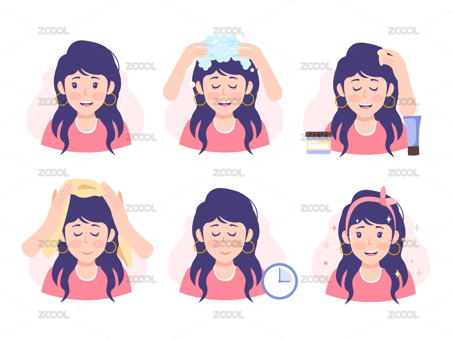 可爱女孩涂抹护肤品化妆品步骤矢量插图