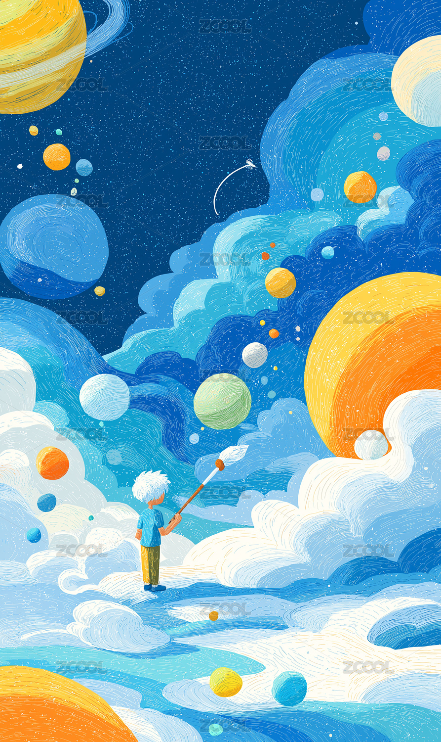 少女仰望着灯泡里的宇宙星辰插画壁纸