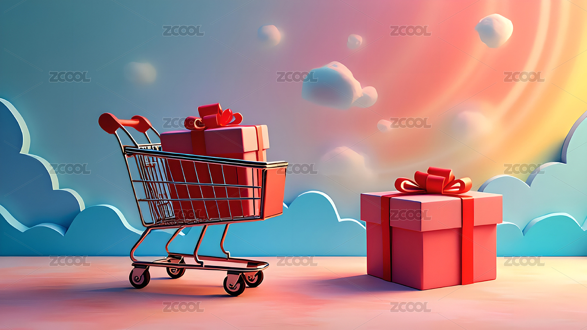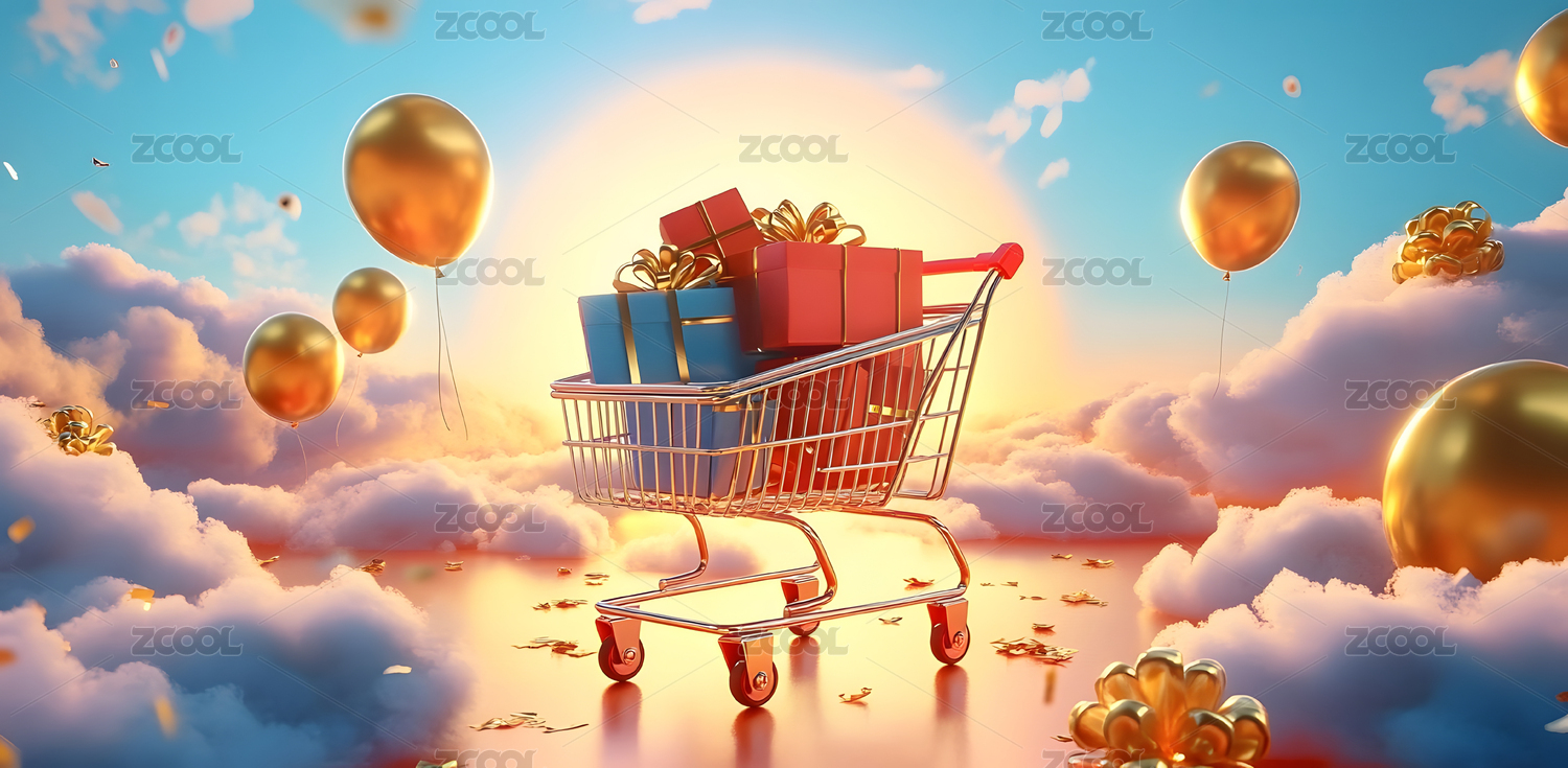 3D卡通金色购物车礼物盒节日活动场景