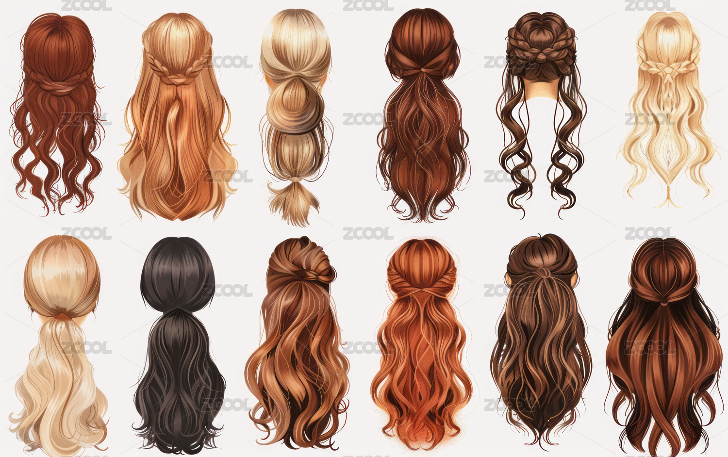 头发,发型,参考图,假发,插画,发色,示意图,柔顺,丝滑,款式