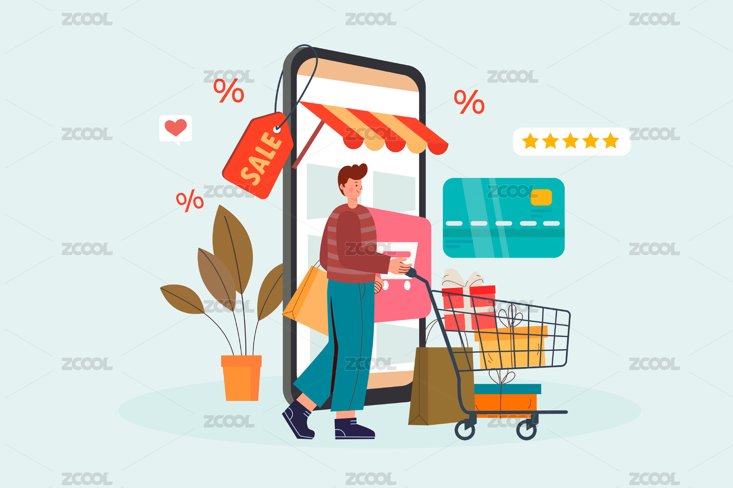 电商购物节的节日促销商业活动,时尚女性用手机在网上购物消费的矢量插画背景