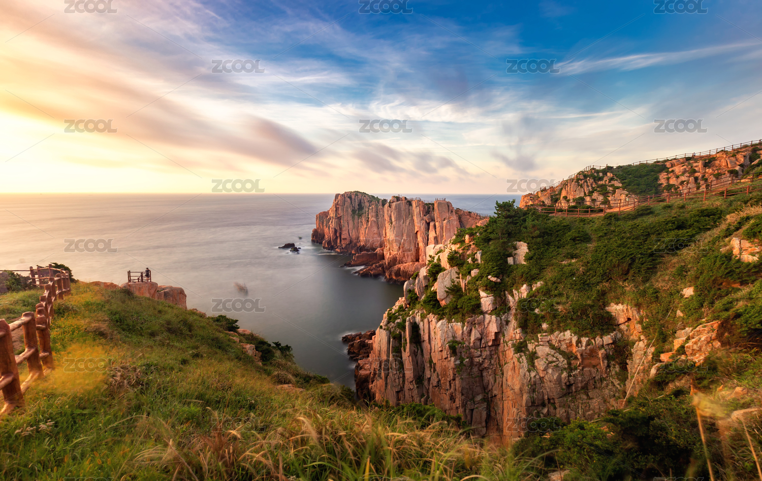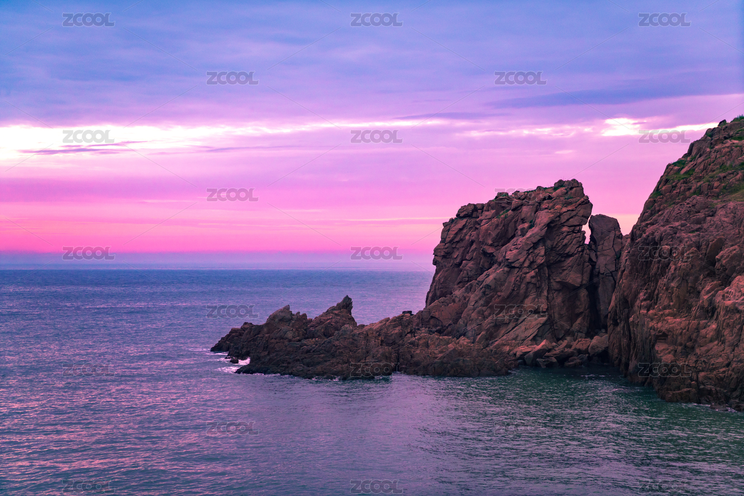 成山头日出时分蓝紫色天空的海岛