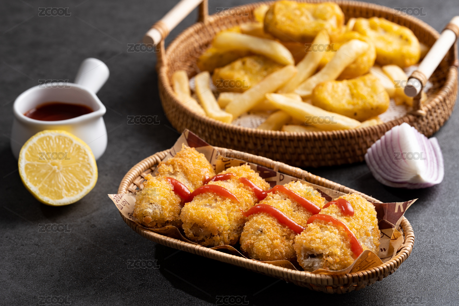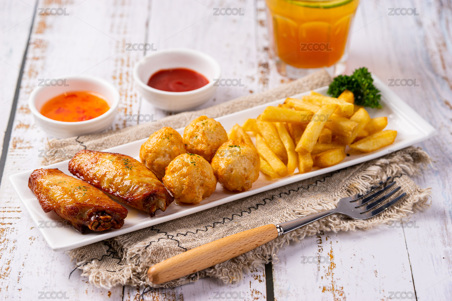 鸡翼墨鱼丸薯条香脆拼盘小食