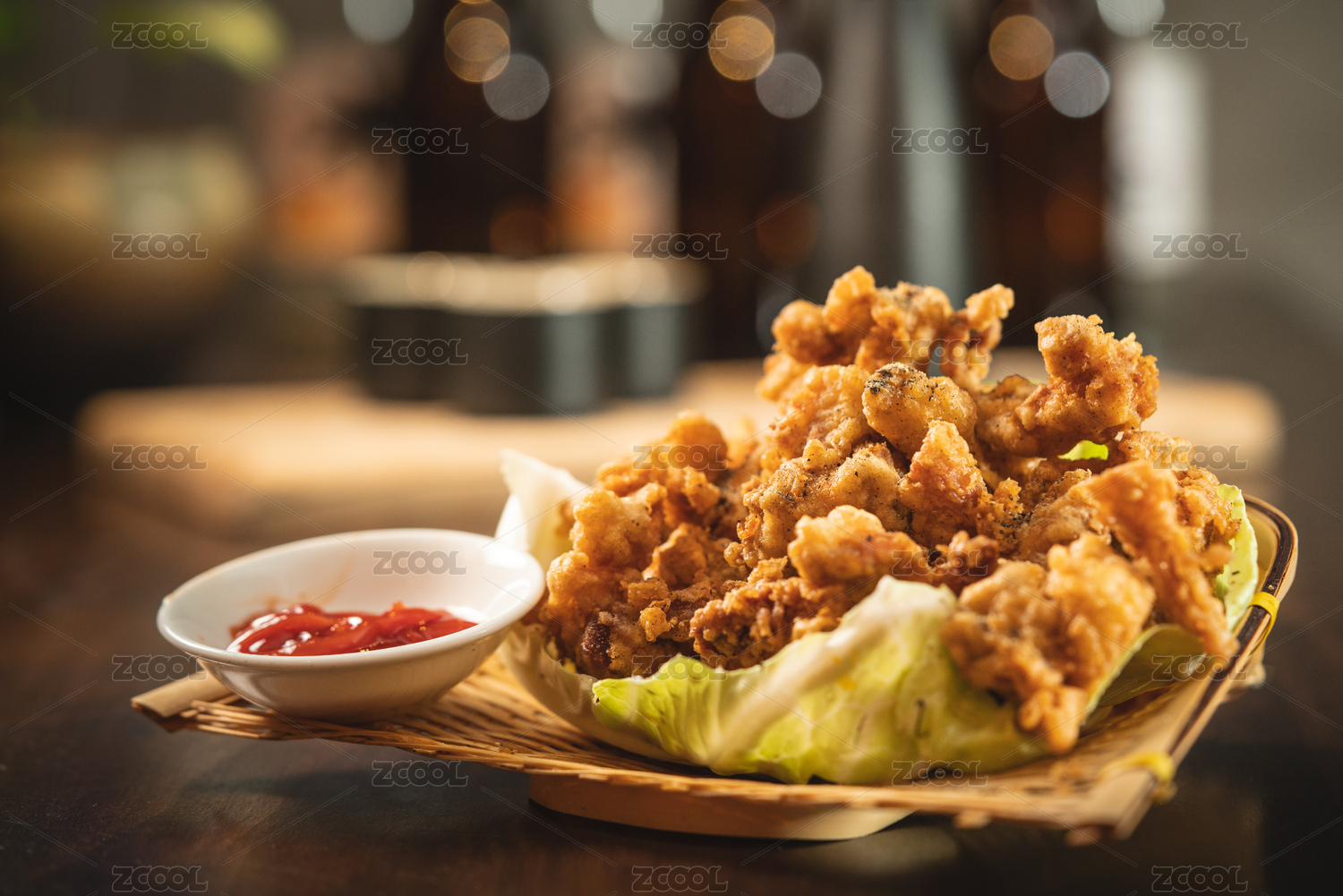 一盘炸鸡拼盘与啤酒摆放在桌面上特写