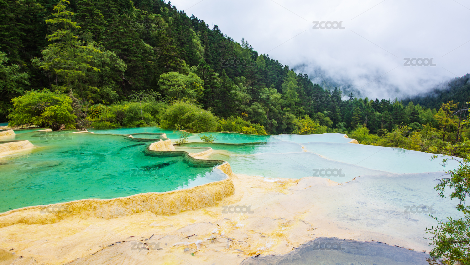 四川阿坝黄龙景区钙华彩池和秋日松林