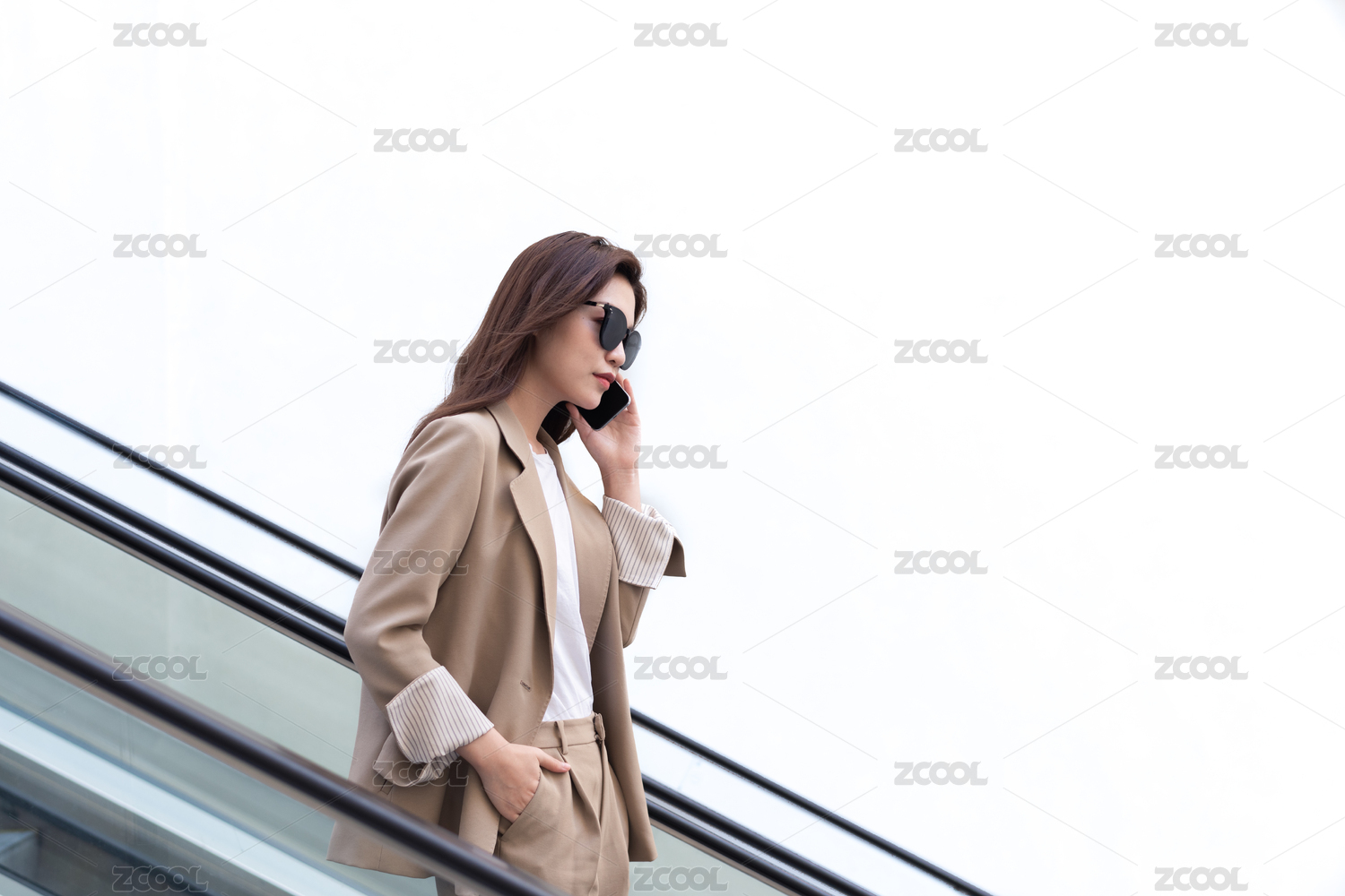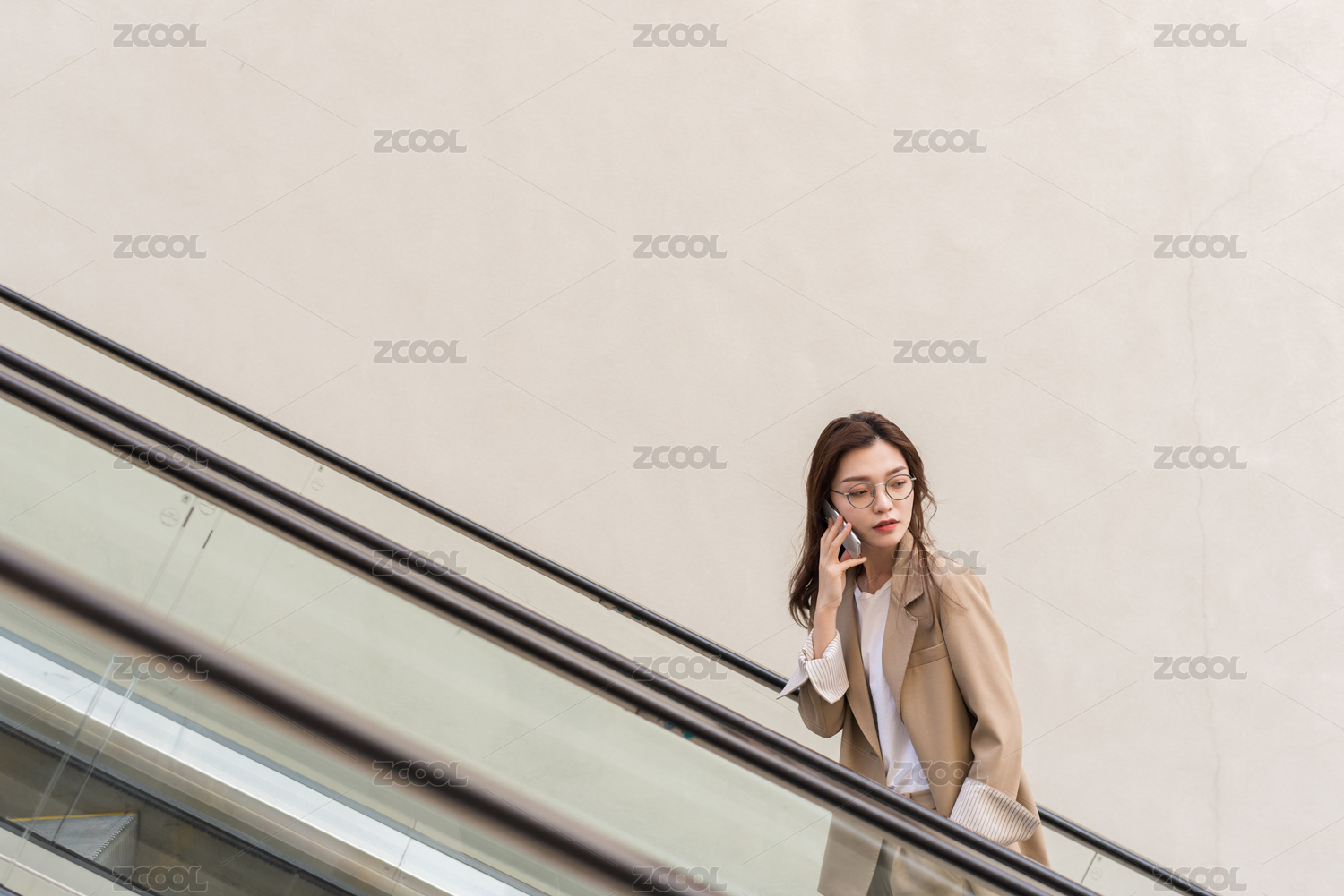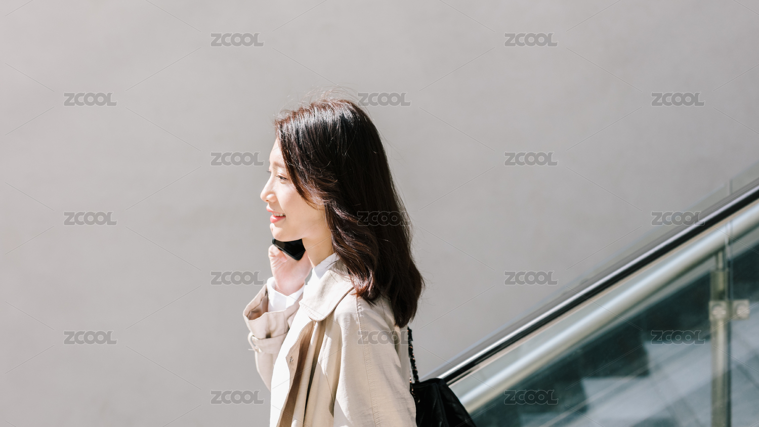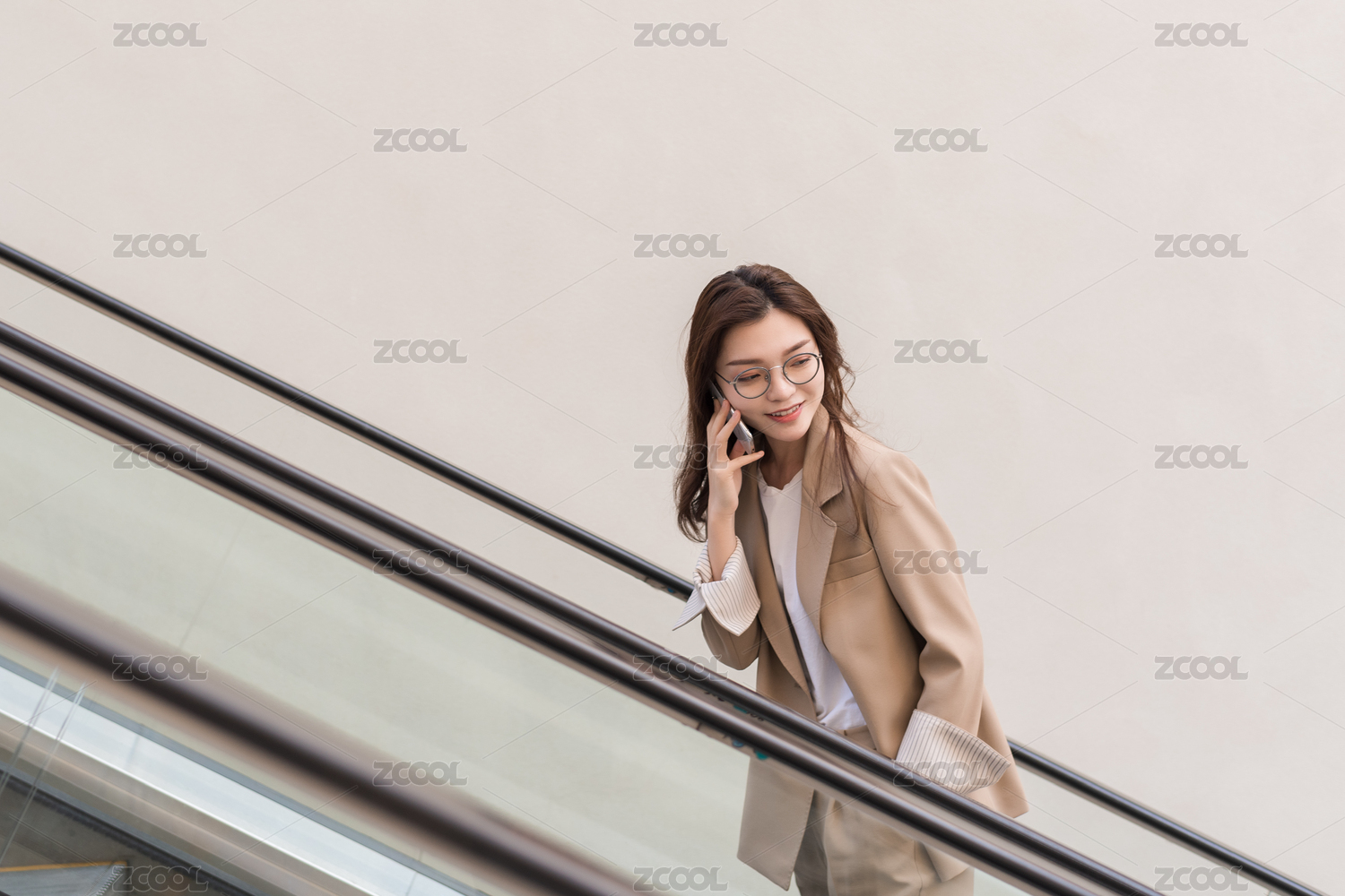 女人,笑,开心,自信,晴天,阳光,室外,手扶梯,手机,接听
