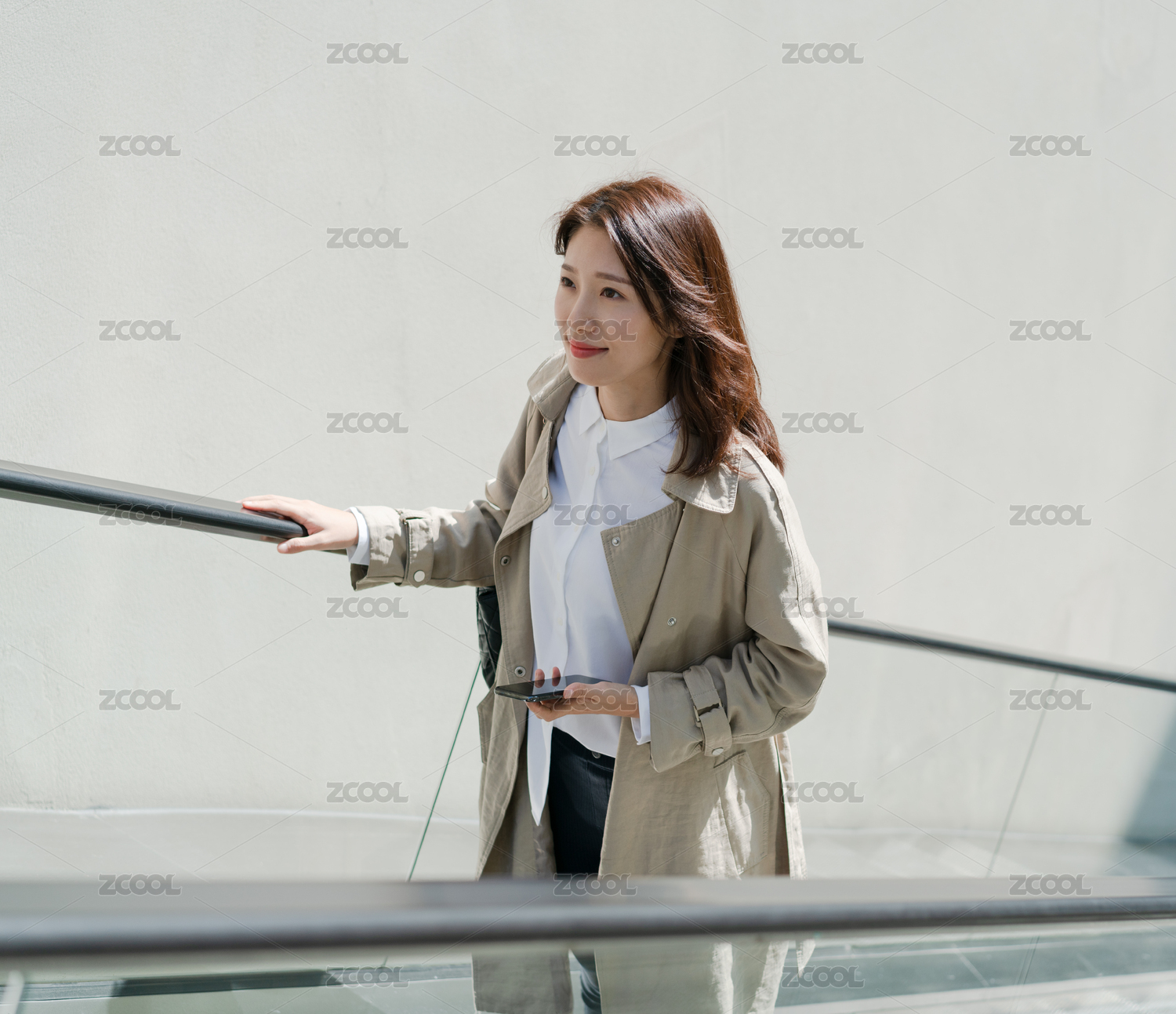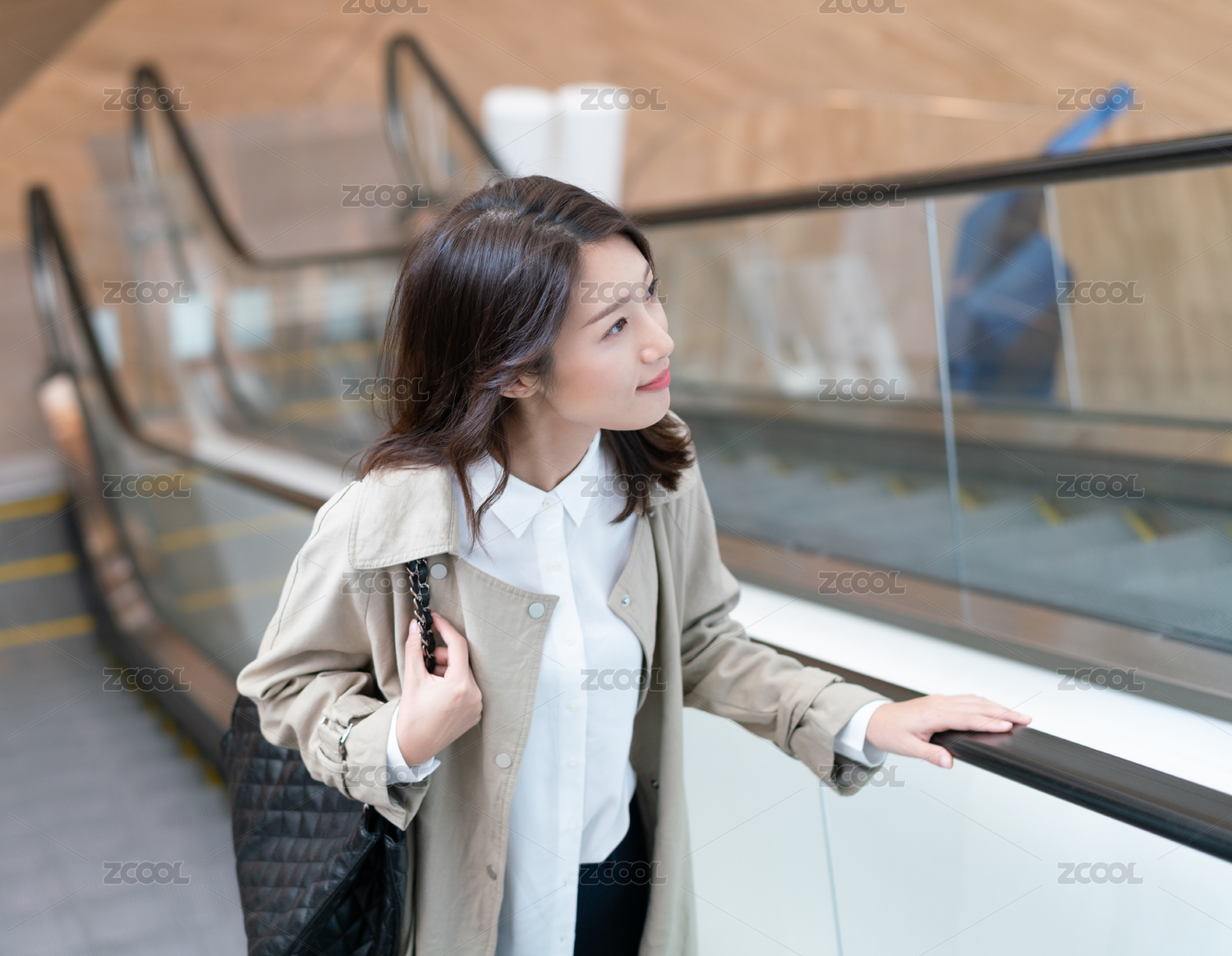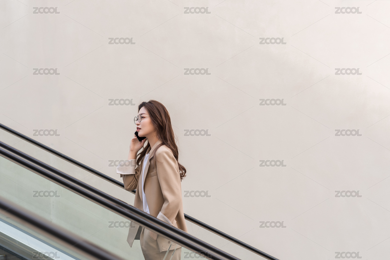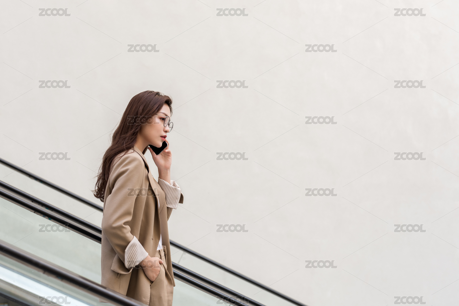 女人,笑,开心,自信,晴天,阳光,室外,手扶梯,手机,接听