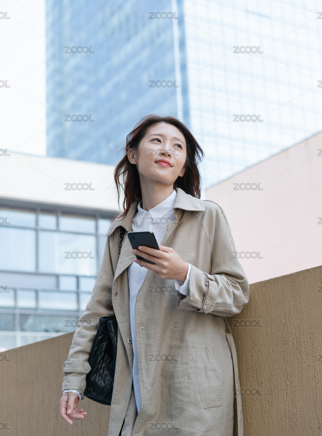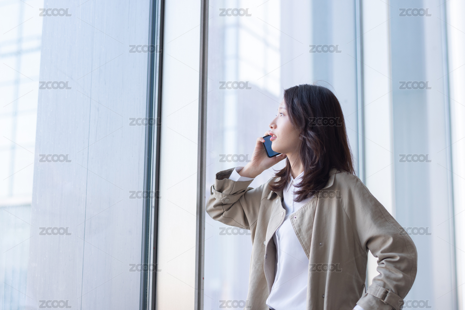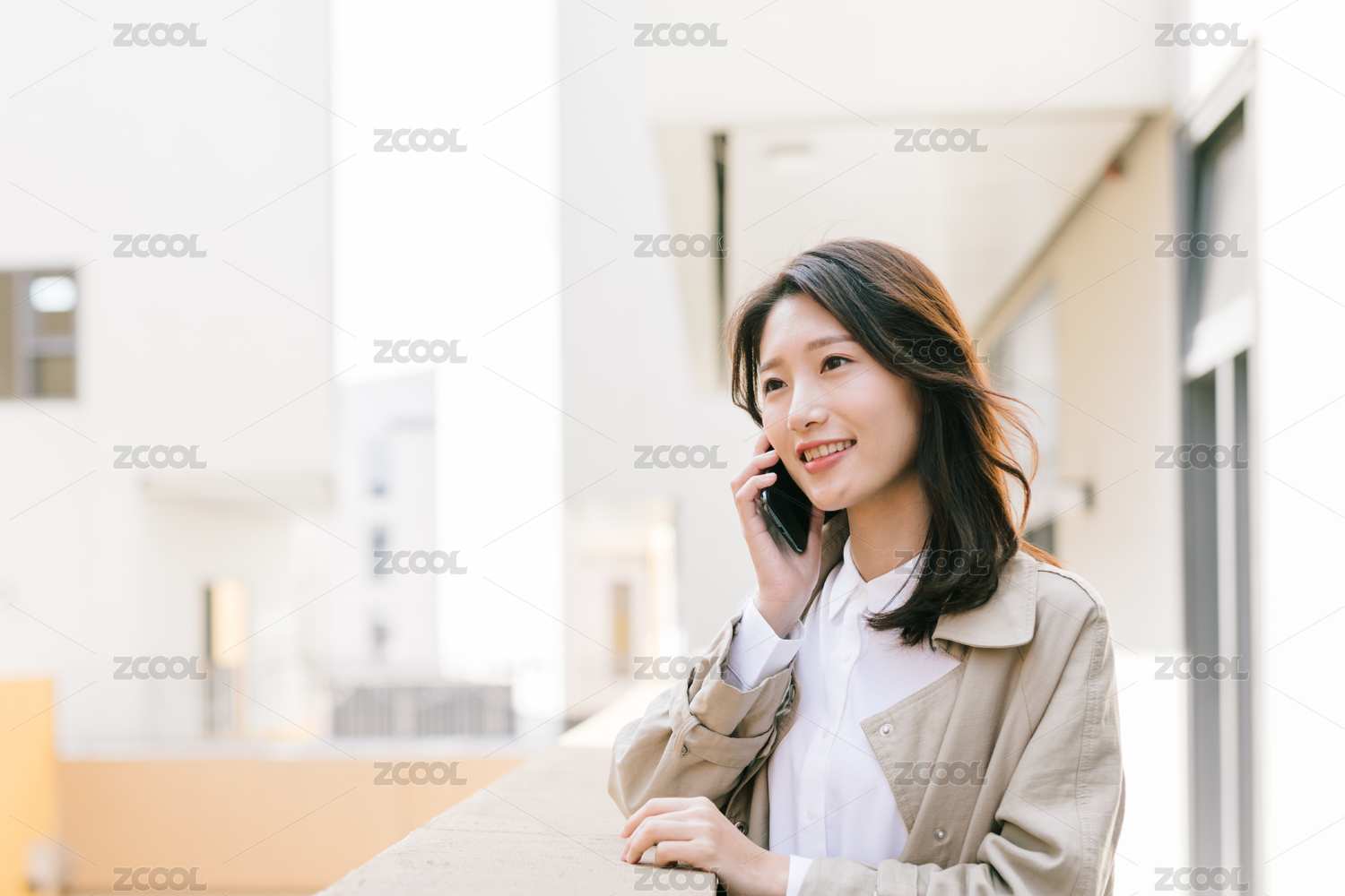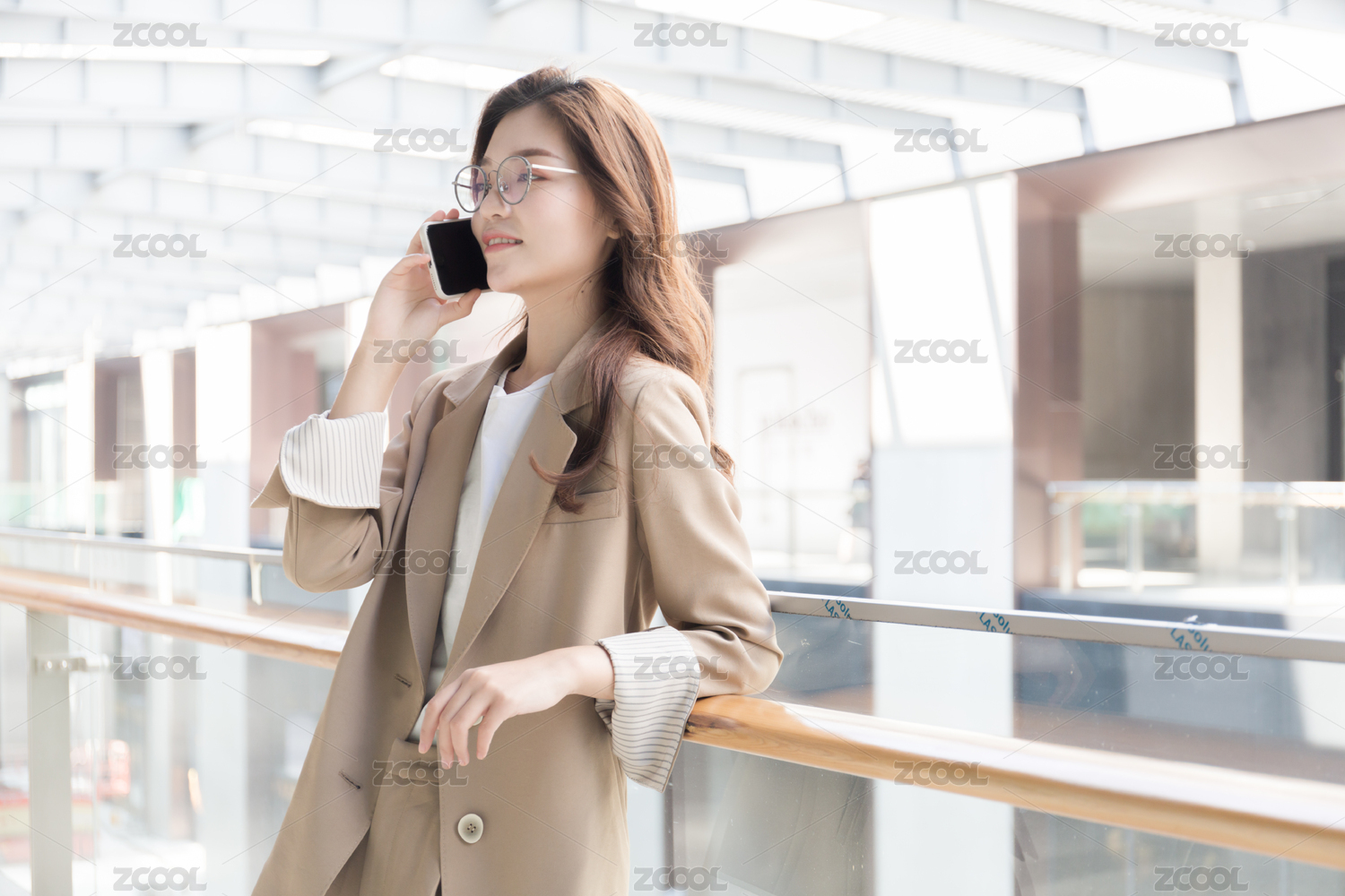 女人,笑,开心,自信,晴天,阳光,室外,手扶梯,手机,接听