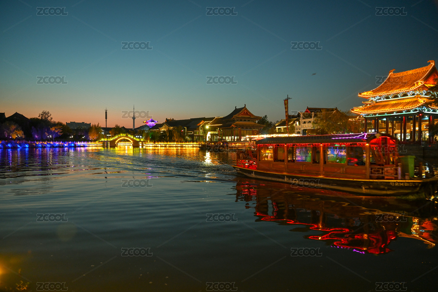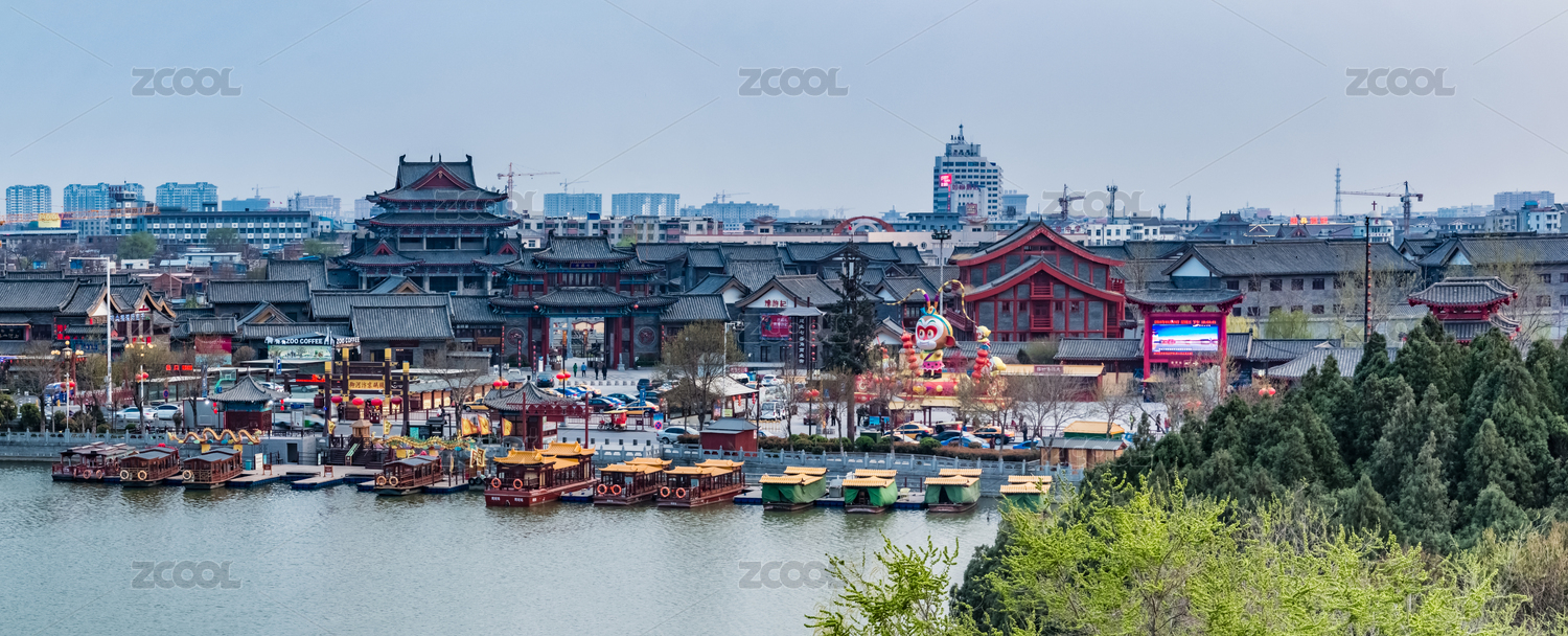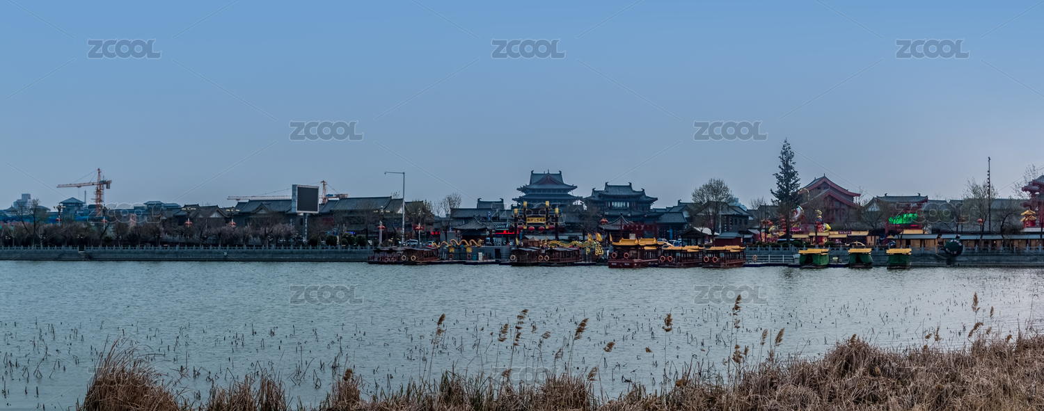 中国开封包公湖蓝天白云日落夕阳建筑风光