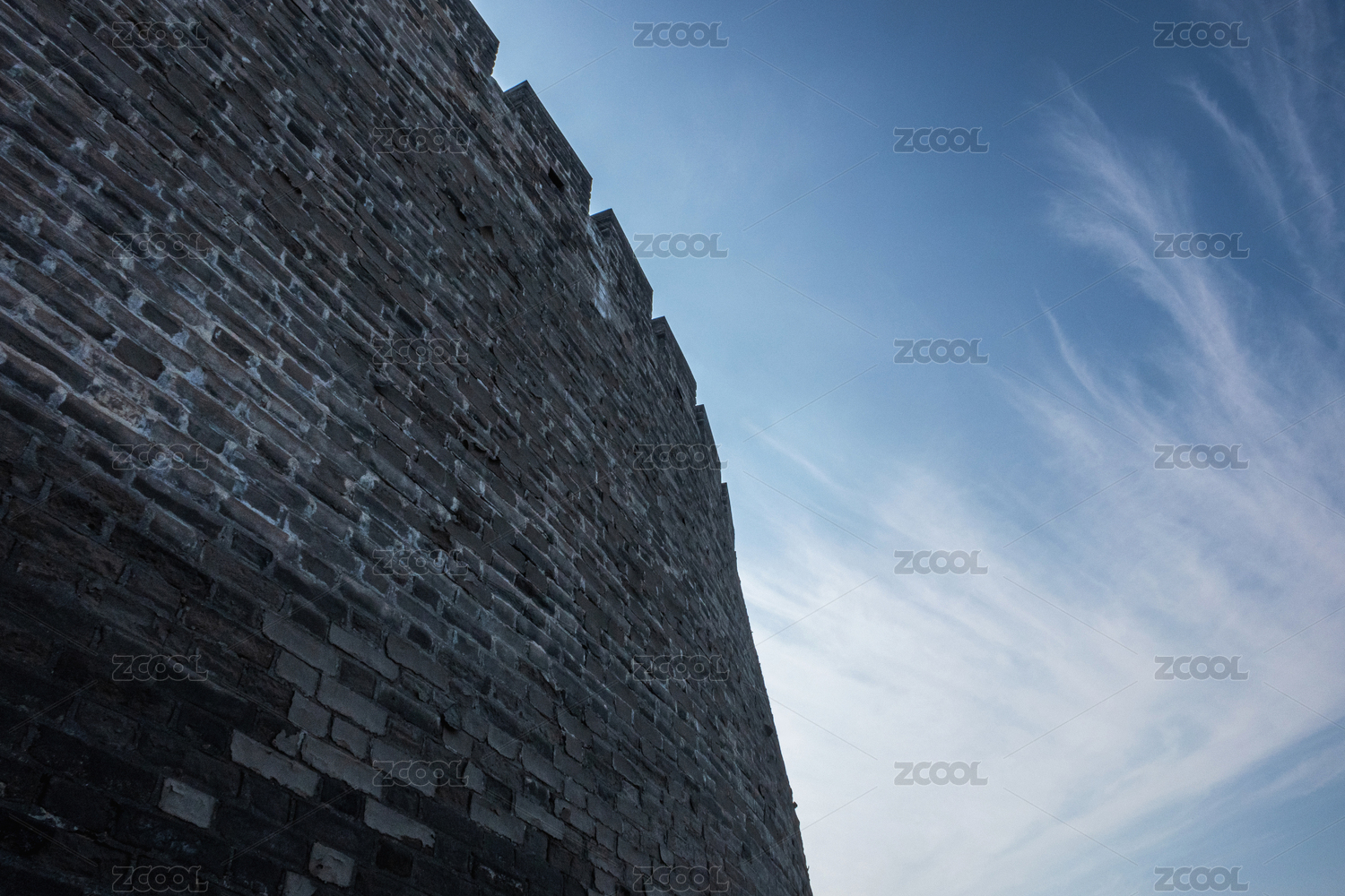中国南京明代古城墙上的砖、垛口和蓝天白云