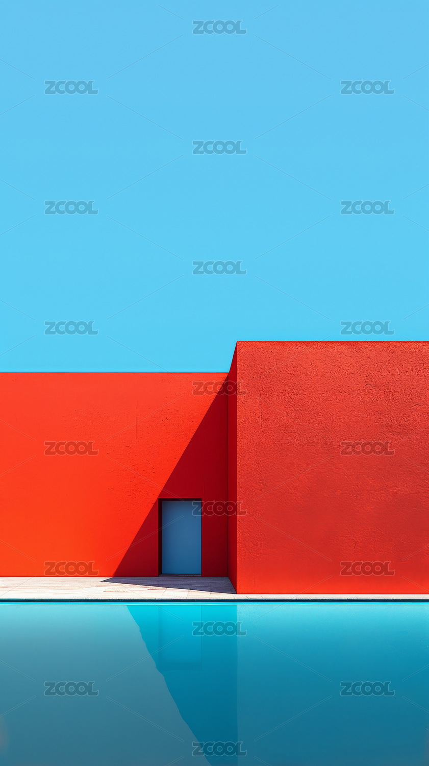 蓝色泳池与红色建筑