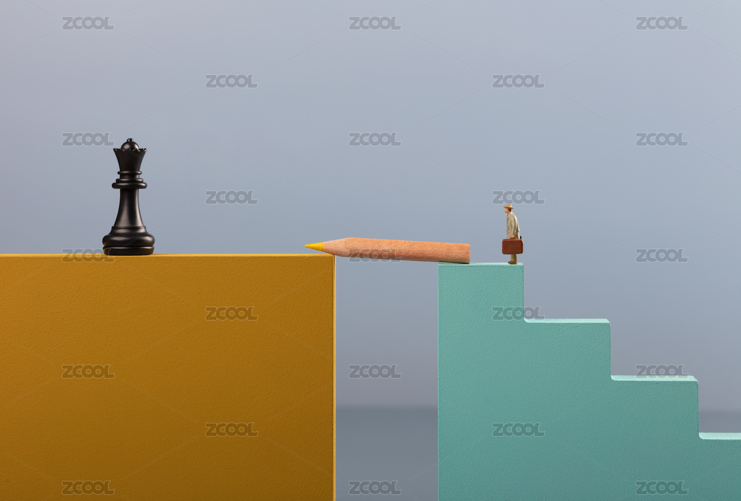 微缩创意站在铅笔上眺望远方的阶梯