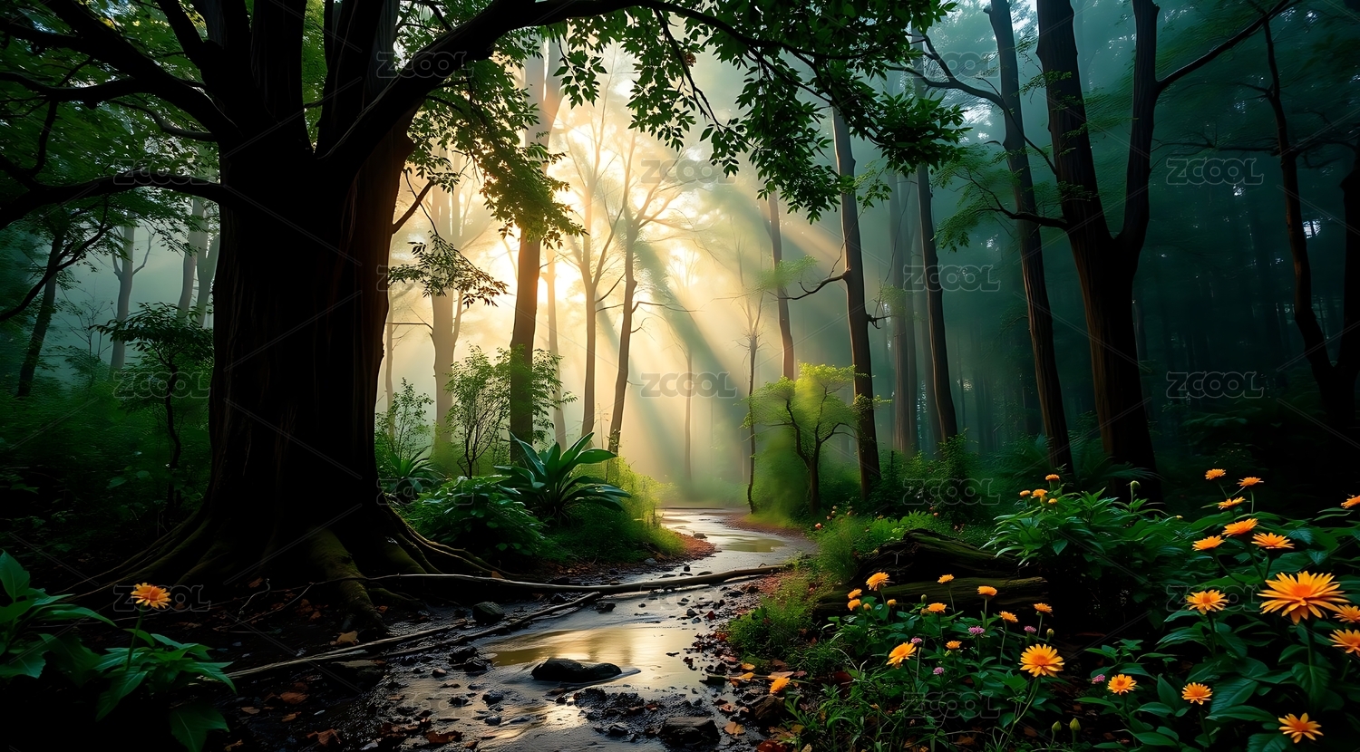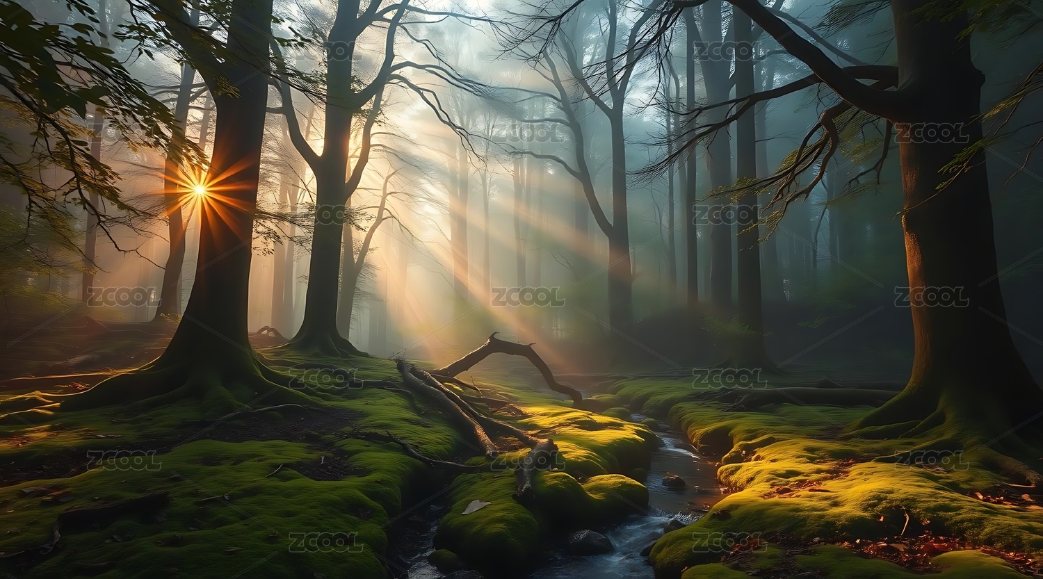 阳光穿透雾气照亮森林小溪