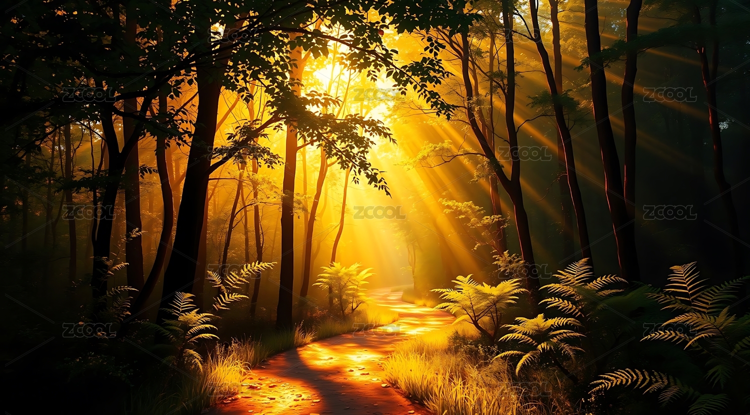阳光穿透森林洒下金色的光芒